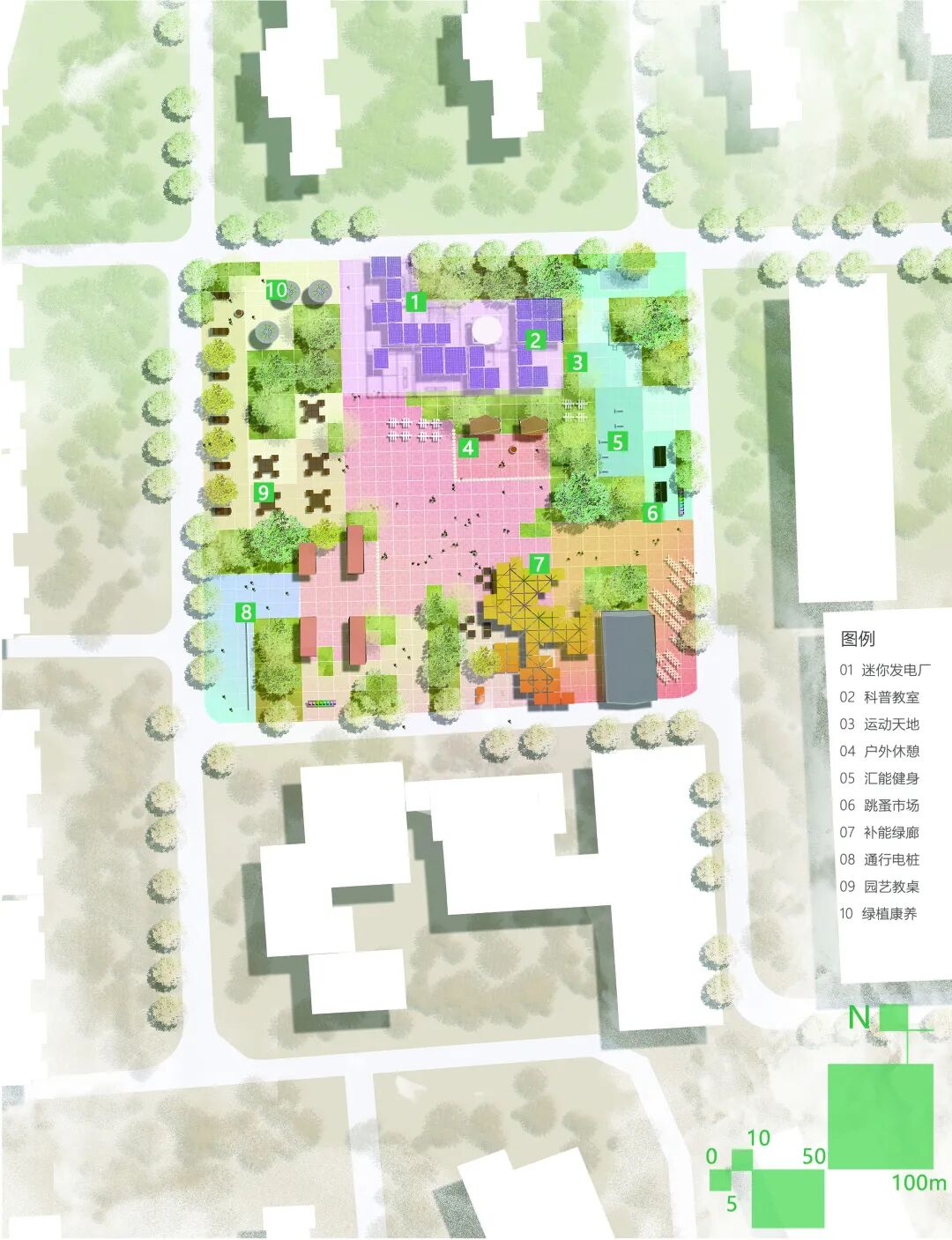 方案让每一位居民均可参与公园模块搭建,实现共创共享。公园可根据居民需求,灵活变动位置、数量,实时更替,演绎不同场景单元。“绿宝魔方”可拆解为便于运输的模块组件,用于同模式公园间的循环利用。通过共创迭代生成文教共享、康养疗愈、体育健身、集市商业、社交娱乐等多元场景,探索公园的多维可能。