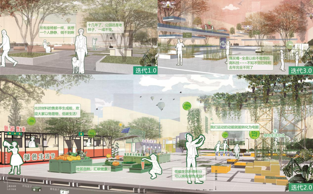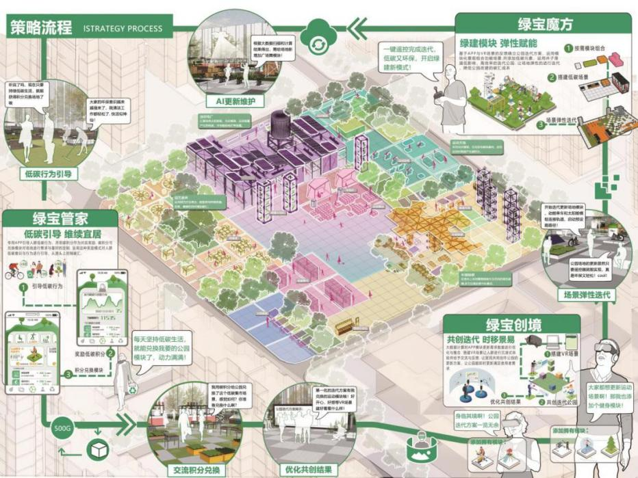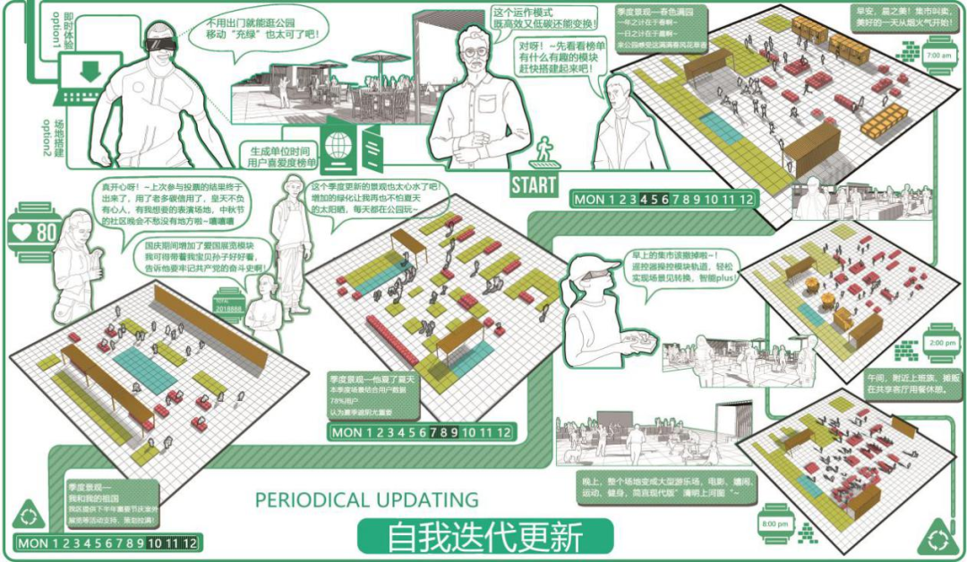 该作品选择城市老旧社区公园作为迭代改造设计的研究对象。这些公共绿地存在空间窄小、设施简陋、景观陈旧的普遍现象,而且更新缓慢、施工复杂,难以满足人们新时代日益变化的需求。设计师试图创建一种“充绿宝”的模式,通过市民低碳生活方式,赢取低碳积分,再换取绿建模块,并利用大数据和智能技术,高效实现公共绿地空间的场景更新迭代,满足公共绿地空间低碳、节能、共创、多样、共享的目标。该设计构思前卫,符合国家的新发展导向,但理念多于实践效应。