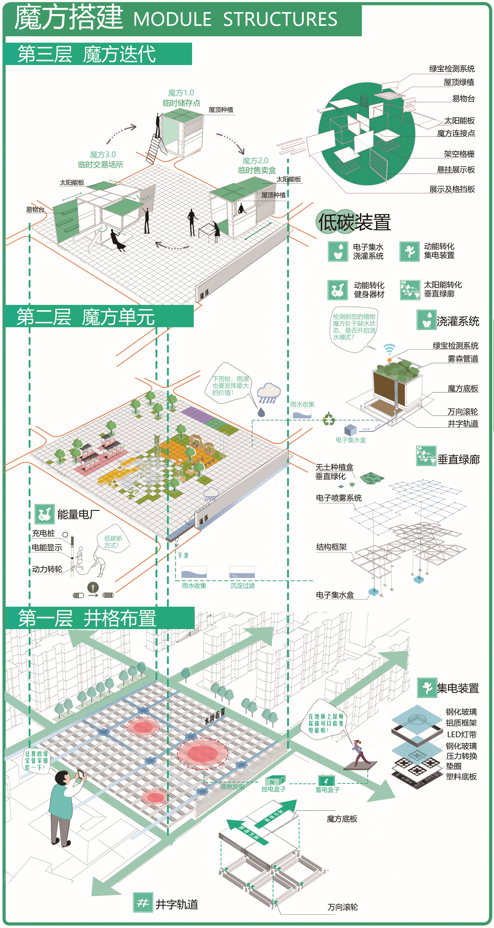 方案提出“城市充绿宝”的概念,构建一种可自我迭代、共享进化的低碳公园新模式,通过绿宝魔方、绿宝管家、绿宝创境三个协同使用的子系统,链接场地与使用人群,让城市即时“充绿”,低碳更新。