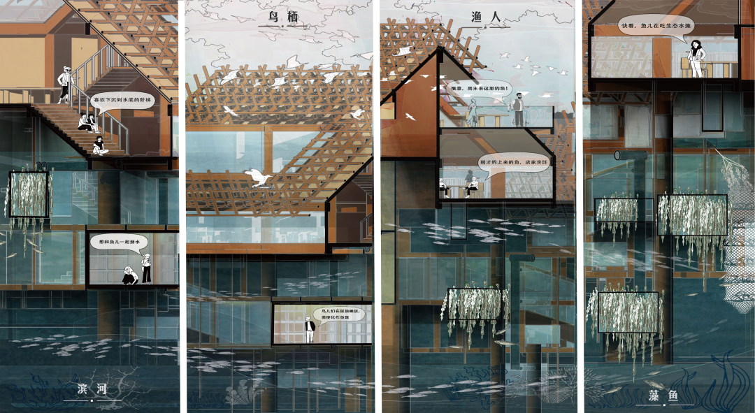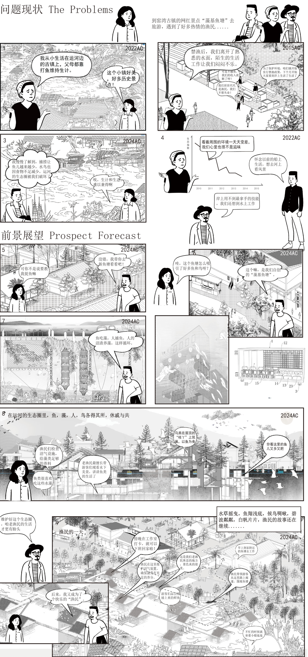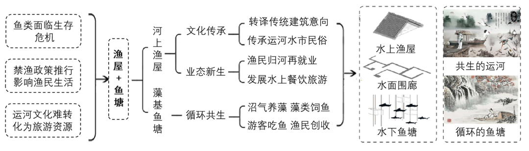 作品立足渔民退捕转产这一背景,提出“运河生态圈”的设计理念,将河上渔屋、藻基鱼塘等富有创意的设计元素融入方案,形成生产生活生态三者的“循环”关系,为当地水域生态环境改善、渔业资源保护、渔民生产生活条件改善和文旅业态发展提供了可借鉴的实施路径。