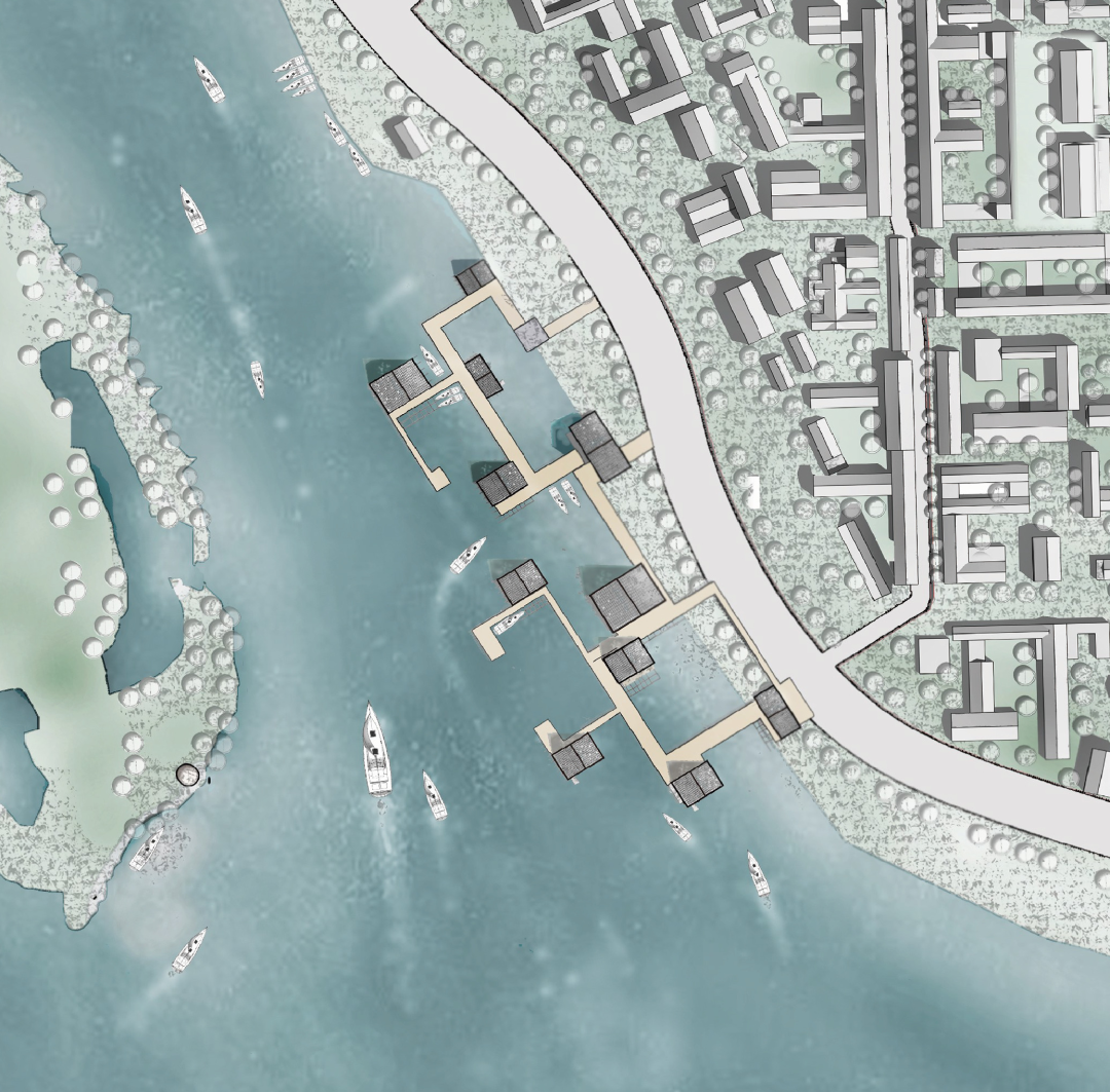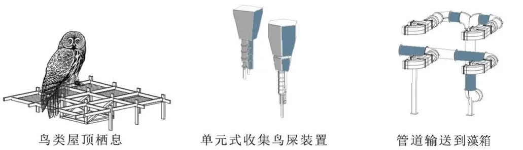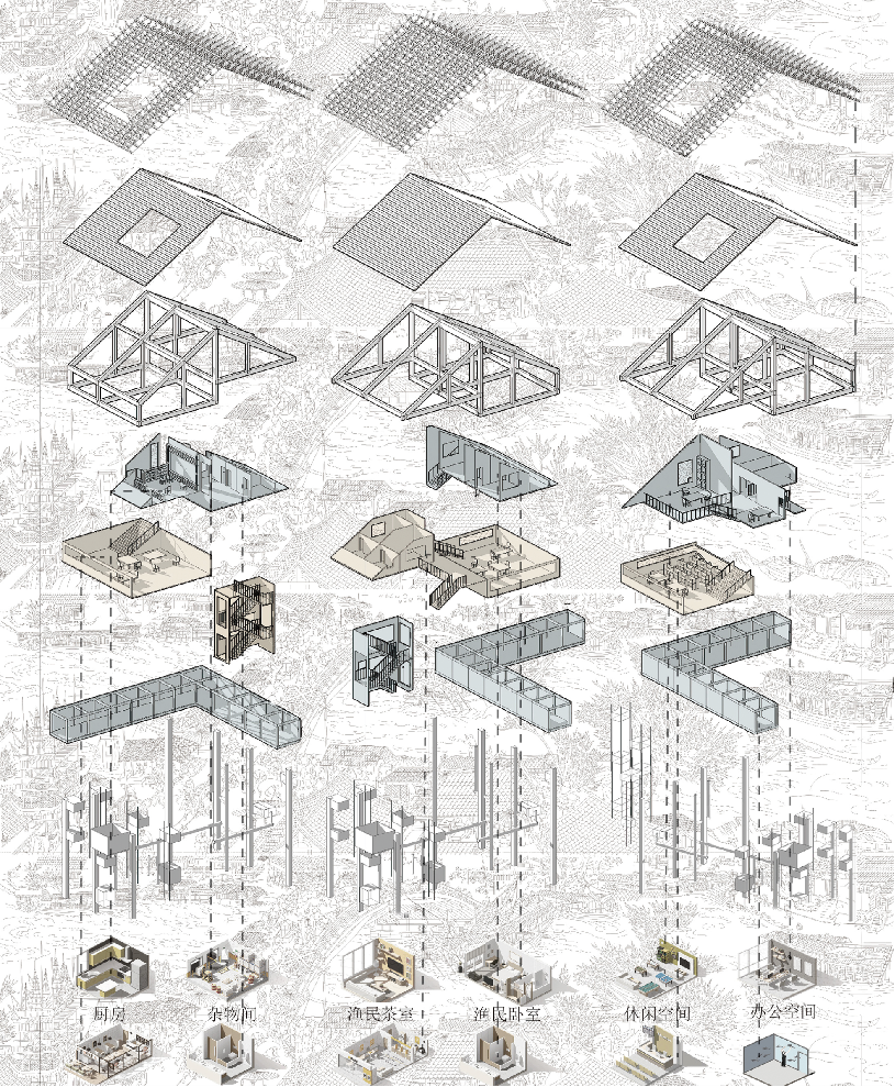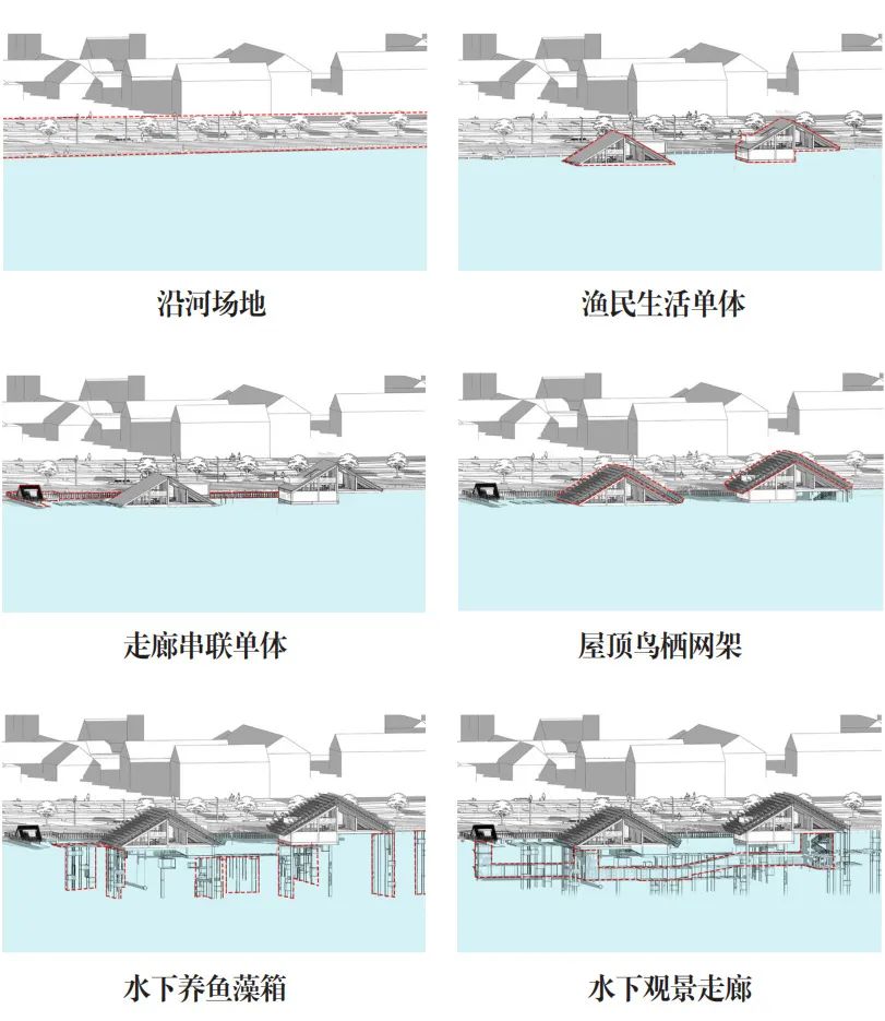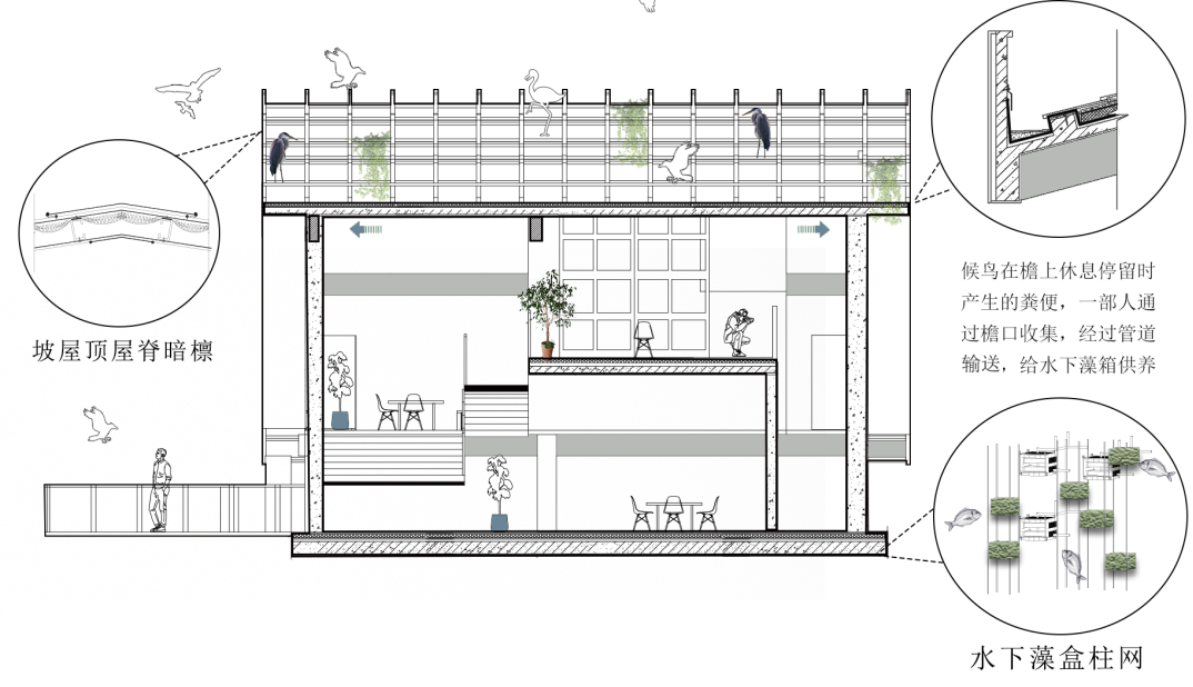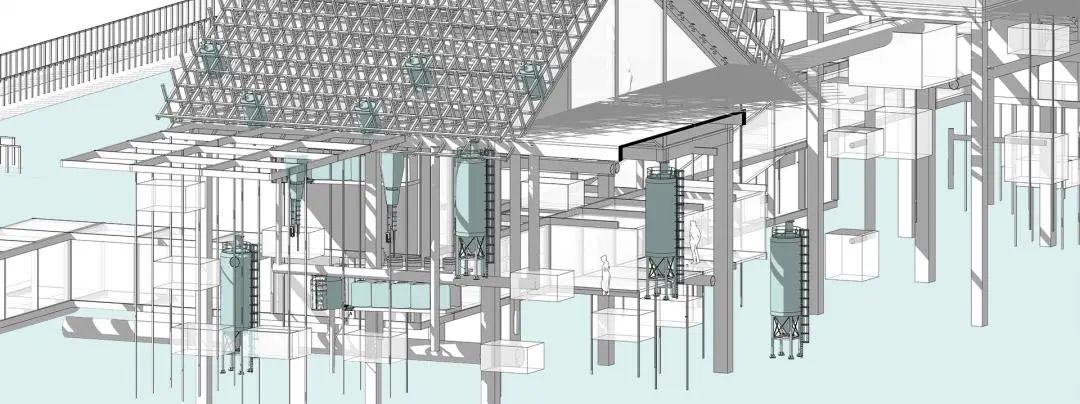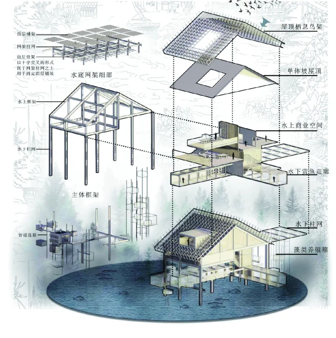 藻基鱼塘单体由栖息鸟架、餐厅商业空间以及水下藻箱柱网组成。鱼塘单体以竖向流线为设计方式,打造形成可灵活组合的小型生态循环系统。