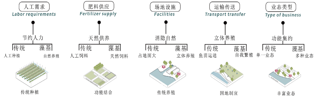△ 传统鱼塘与藻基鱼塘模式对比示意图