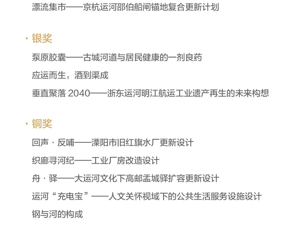 参赛作品聚焦具有真实的历史记忆和历史文化的场地,创作了一批题材多元、亮点纷呈、富有创意的设计方案。近期微信公众号将逐步推出第九届紫金奖建筑赛获奖作品解读,期待能为大运河文化保护传承与创新,大运河活力空间的当代塑造提供思考启迪。