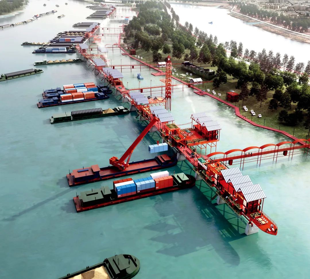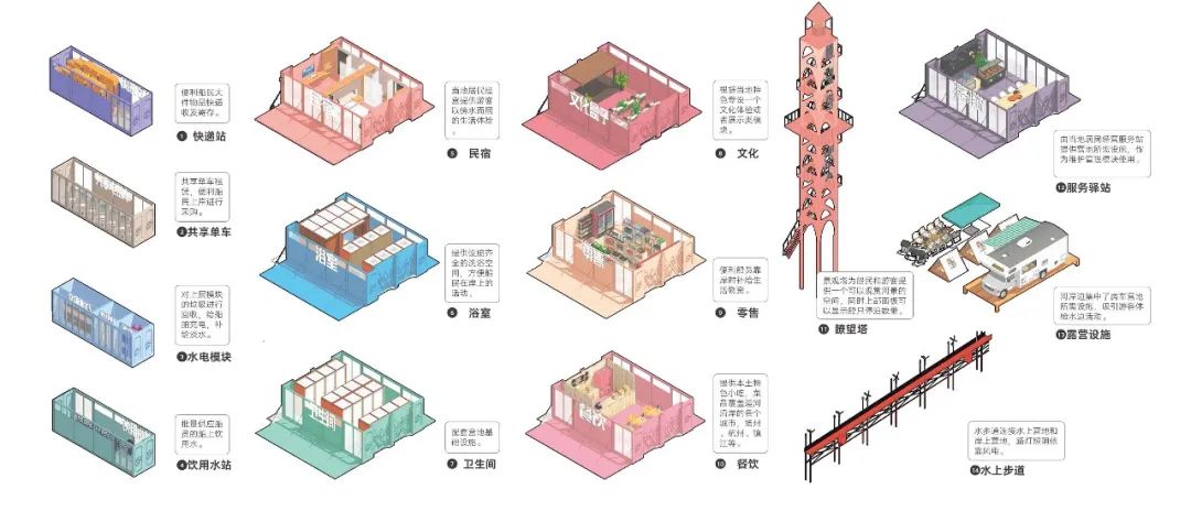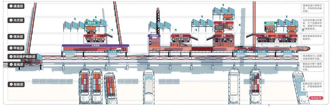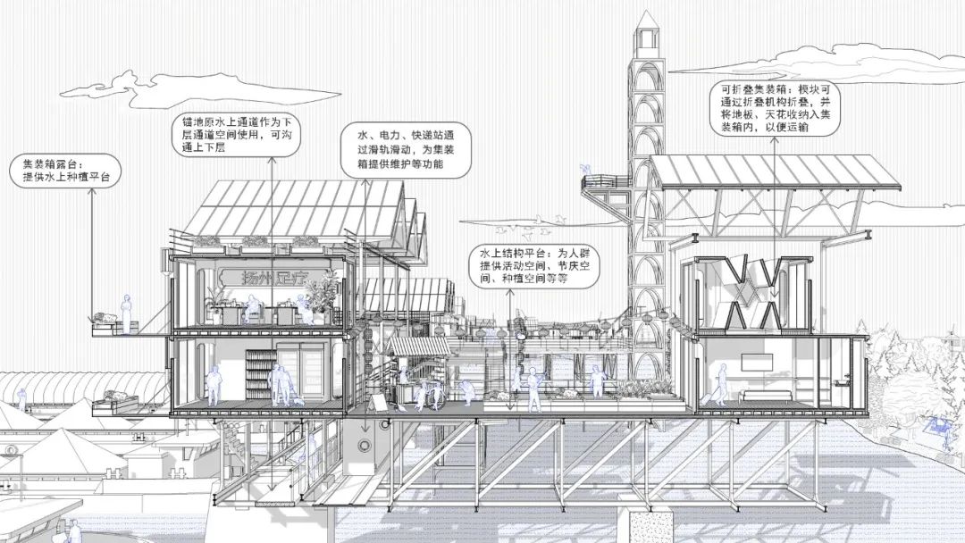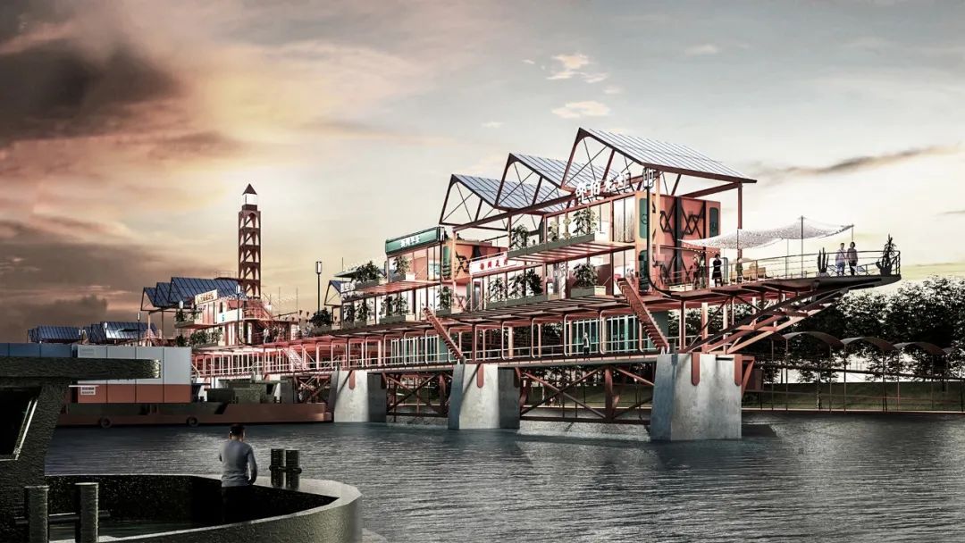 扬州市邵伯镇是本届大赛组委会发布的设计基地之一,作品以该镇船闸锚地为设计对象,着眼于不同人群的需求和互动关系,以方便水路运输、快速搭建的思路,通过采用可拆卸、可折叠的集装箱模块、光伏发电和风力发电等技术应用,打造出集地域文化展示、物资补给、旅游体验等功能于一体的复合型公共空间。