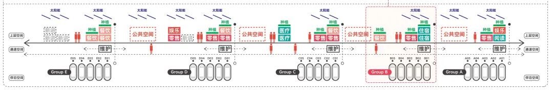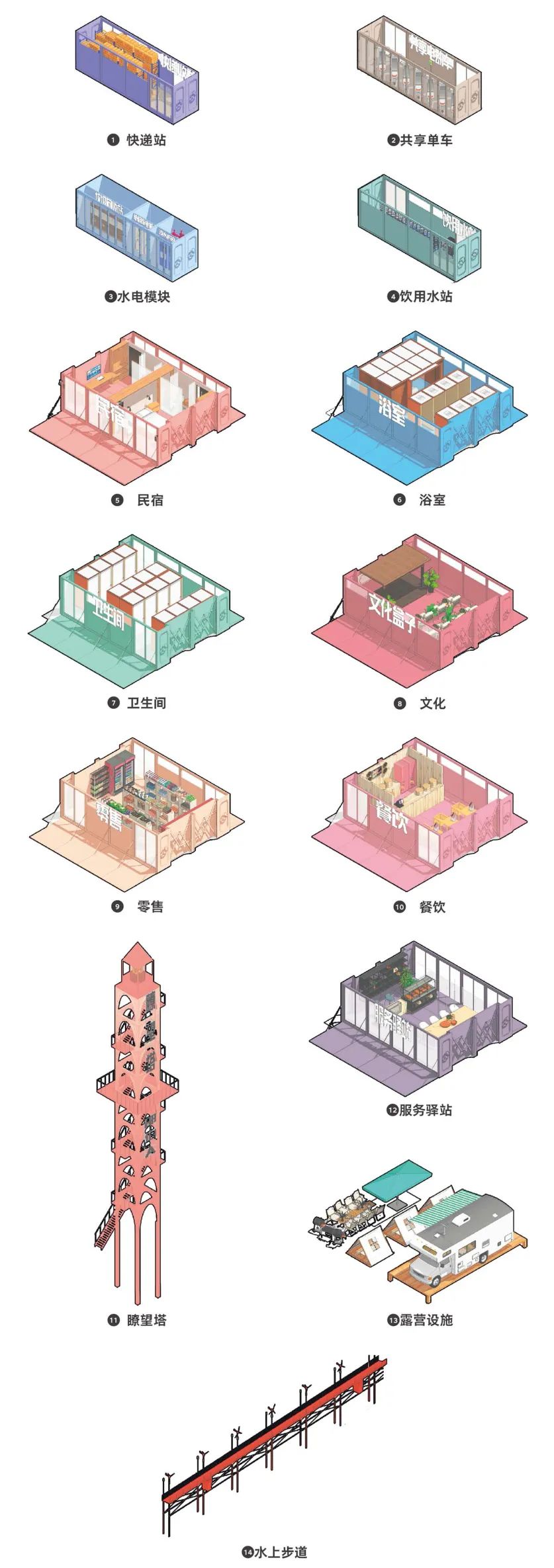 其次,为减少船民的步行距离,我们以每200米(即10个泊位的宽度)作为一个功能组团,根据统计得来的船只流量,在每个组团上布置基础消费模块;根据服务人数,每2~3个组团布置1组棋牌和运动等休闲娱乐模块;整个设施布置1组医疗和管理模块。