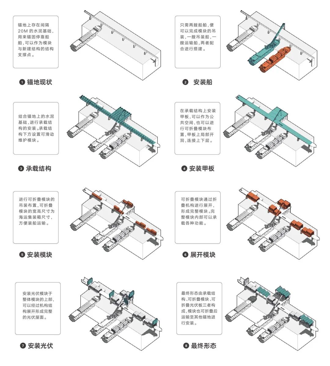 首先,我们通过对外开放的船舶位置服务平台,统计出锚地上日均活跃的停泊船次,从而推算出功能模块的基本数量。再根据各个锚地附近的往来游客潜力,对模块的数量进行酌情增减,同时为了兼顾众多停泊船舶,模块以线性形式,均匀地分布在锚地的混凝土支座上。