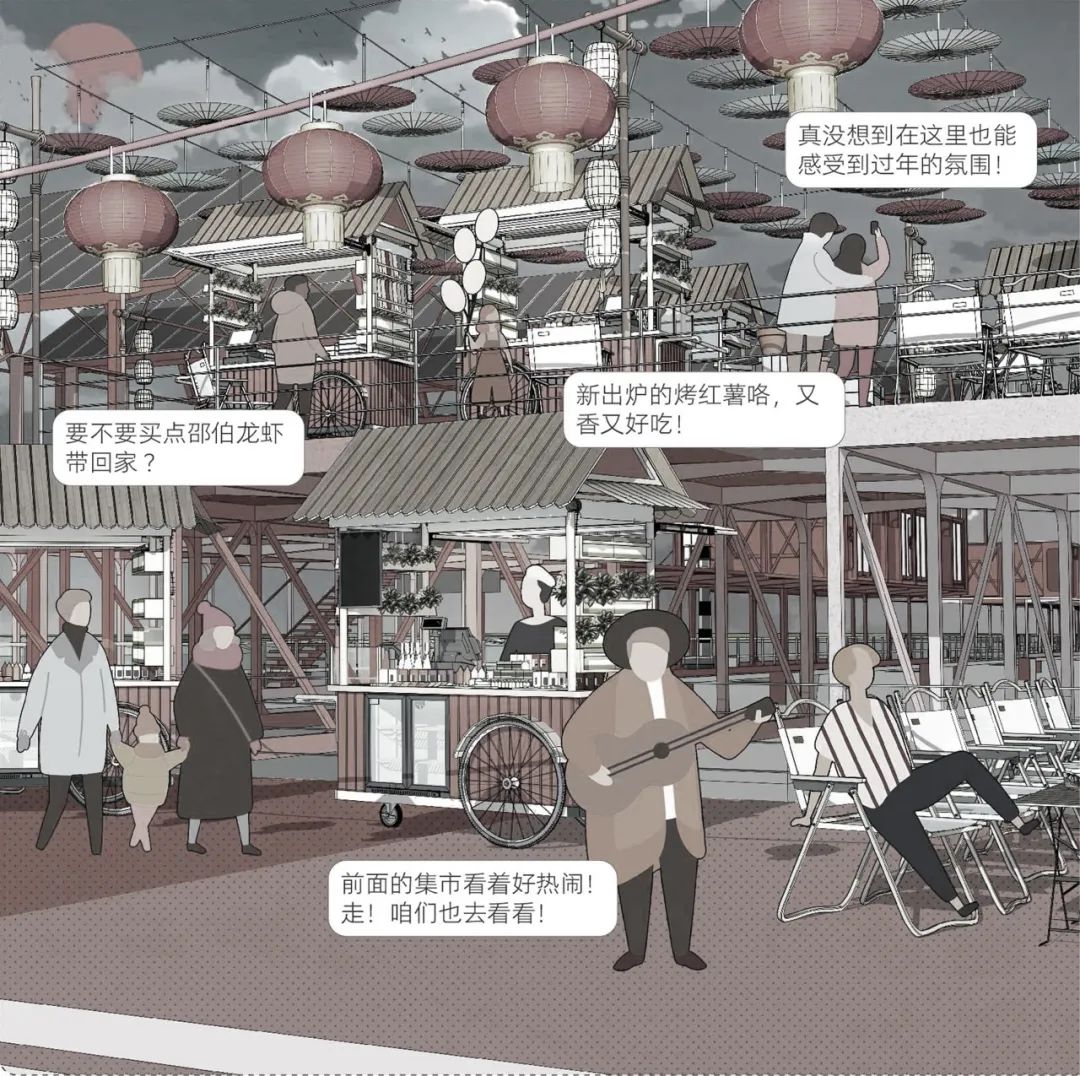 作品以“漂流集市”的独特构思,将一个城市空间的可流动性特征表现得淋漓尽致。与此同时,设计师对搭建方式和模块组合、能源供给等技术层面的想法也比较深入,方案所构想的复合更新模式既具有创意,又提供了较具操作性的现实发展路径,描绘了一个后工业时代的水上“清明上河图”片段。