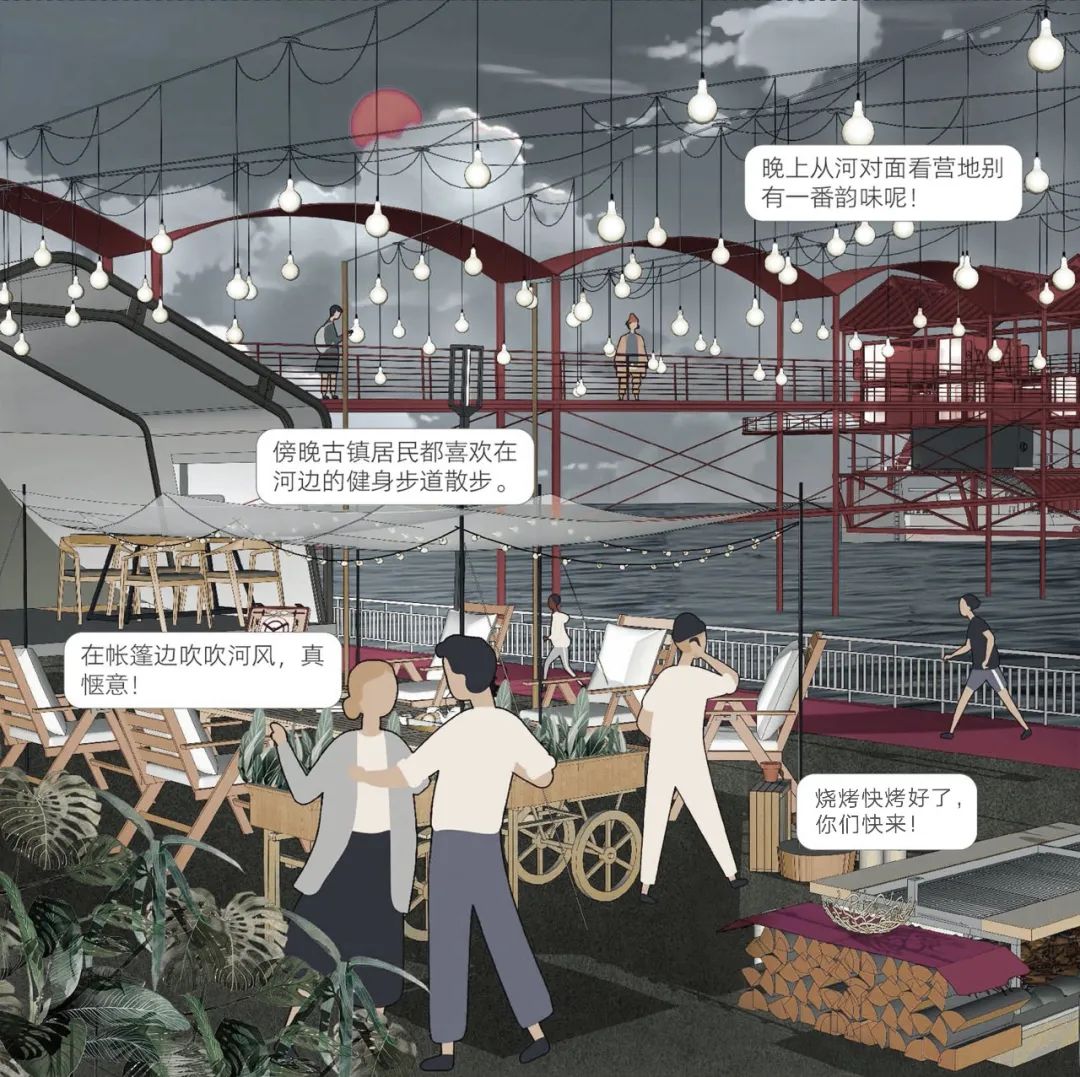 “漂流集市”主要为运河跑船人、沿河城镇居民和外地游客三类不同人群,提供服务设施和交流互动场所。对于跑船人而言,集市是船民与船民之间互助交往、增进归属感的港湾,同时借助商业功能的实现,集市成为跑船人同当地居民建立长期友谊的便民驿站。对于当地居民而言,集市是他们向游客和船民展示本土民俗、特色美食和手工艺品的窗口。对于游客而言,这里有不同于城市生活的露天营地、篝火盛会,还有可以体验船民生活的水上民宿。总而言之,“漂流集市”以锚地为依托,以场所活动为载体,通过人群的互动交流,使人们情感的联系更加紧密。