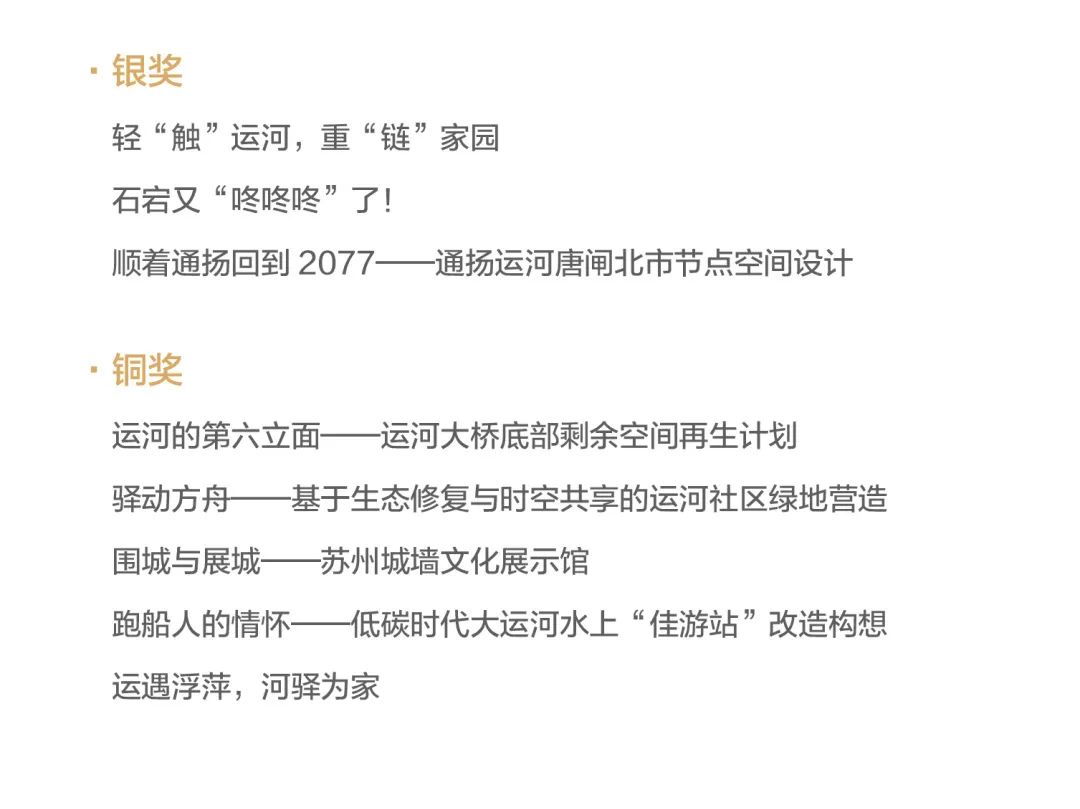 参赛作品聚焦具有真实的历史记忆和历史文化的场地,创作了一批题材多元、亮点纷呈、富有创意的设计方案。近期微信公众号将逐步推出第九届紫金奖建筑赛获奖作品解读,期待能为大运河文化保护传承与创新,大运河活力空间的当代塑造提供思考启迪。