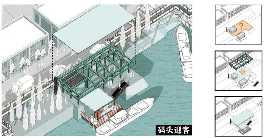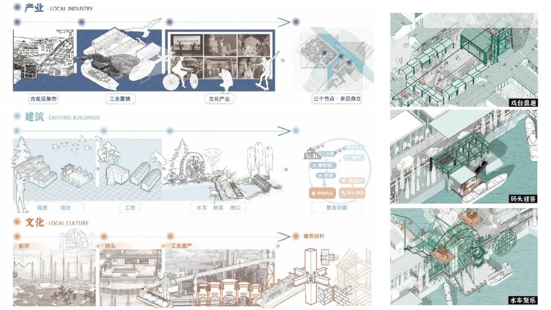唐闸古镇作为通扬运河上的重要节点,保留了码头、船闸、桥梁、工厂和民居等历史文化遗存。设计方案选择码头、闸口、戏台等三个滨水空间节点进行了针对性的设计研究,重点以水车的形态语言营造趣味性的空间场景,通过历史、现在和未来时间线的设定,引入智能系统,探索了串联和唐闸古镇核心滨水区域的多种可能性,这一理念对传承运河文化、激发古镇活力和带动文旅产业发展有一定的借鉴意义。