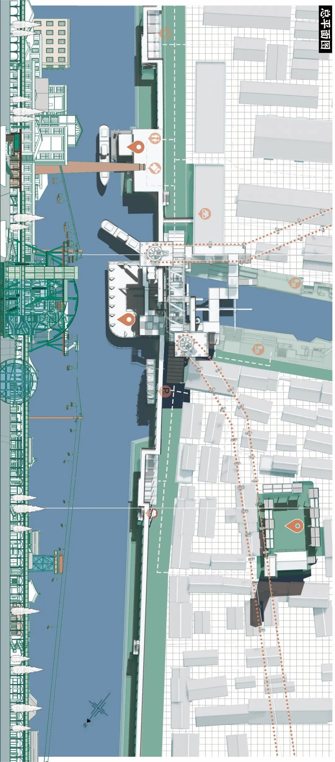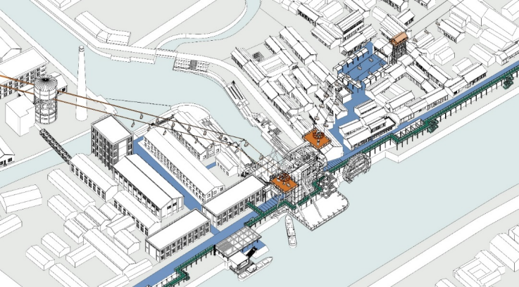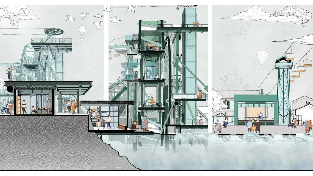 设计充分考虑了运河立体空间的特色,对运河沿线进行空间景观一体化设计,包括:结合高架工业管道形成4.4米标高的“高线公园”,结合水车、戏台等特色空间,设置空中缆车参观流线,丰富运河立体空间层次,提高空间利用效率,为古镇居民与游客带来不同高度、不同尺度、不同方式的空间体验。