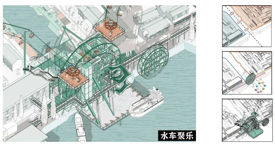 从建筑建构层面来讲,戏台采用砖石基座和木结构,属于古代传统木构建筑的构造手段;码头为钢筋混凝土建筑,属于现代的常用建筑材质;水车以钢构架为主体结构,运用了可替换的功能模块,象征着未来建构方式。