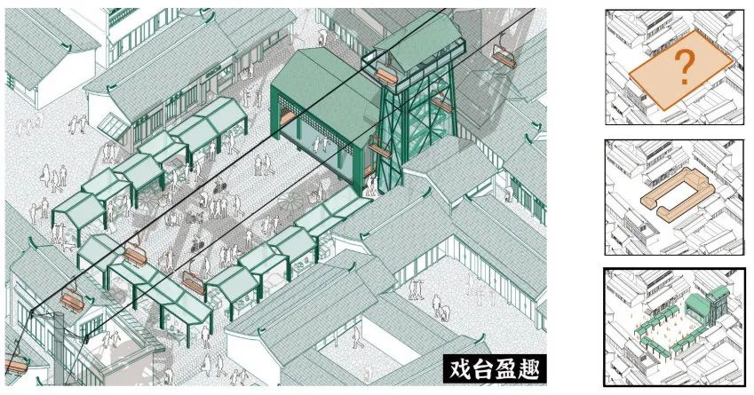 △ 码头(左)、水车(中)和戏台(右)设计剖透视图