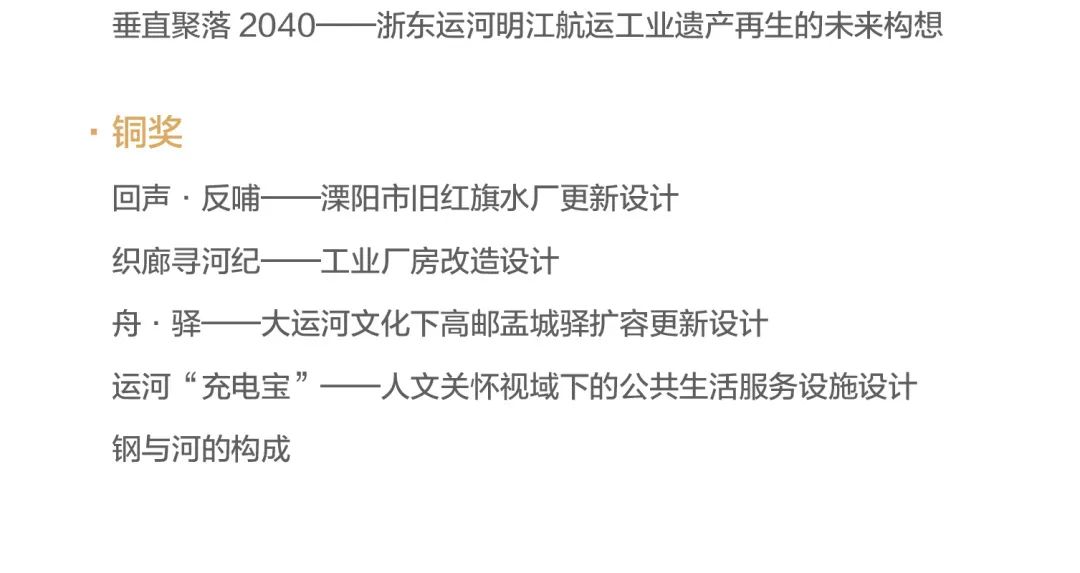 参赛作品聚焦具有真实的历史记忆和历史文化的场地,创作了一批题材多元、亮点纷呈、富有创意的设计方案。近期微信公众号将逐步推出第九届紫金奖建筑赛获奖作品解读,期待能为大运河文化保护传承与创新,大运河活力空间的当代塑造提供思考启迪。