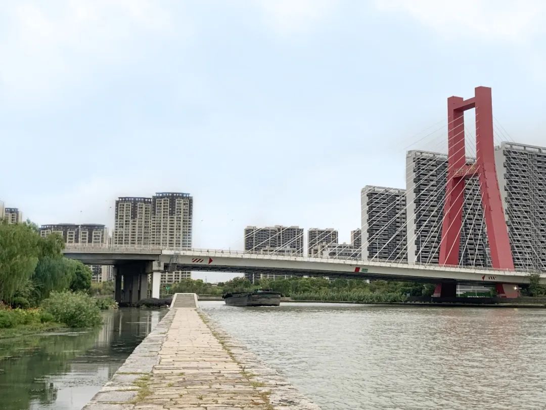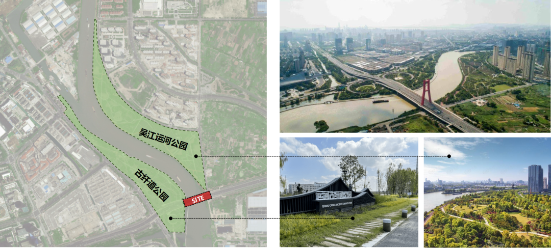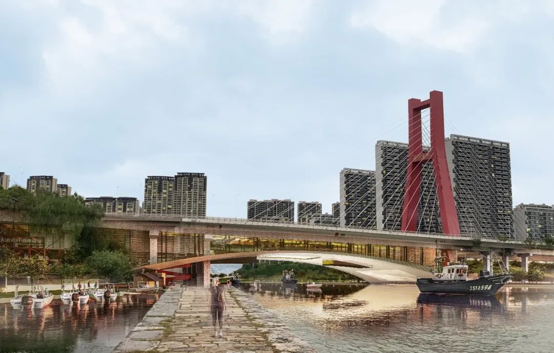 吴江区运河古纤道全长约1800米,始建于唐代,重建于元代至正年间,又称“至正石塘”,现存驳岸的巨型青石为元代遗存。横跨古纤道的吴江运河大桥是一座总长960米的大型桥梁,主桥采用独塔双索面斜拉桥方案并设置钢混结合箱梁结构,主体跨度达120多米。经过调研,我们认为该桥下空间的再利用价值较大,可以成为服务周边百姓的活力空间,也可以与古纤道共同构成大运河文化的纽带。