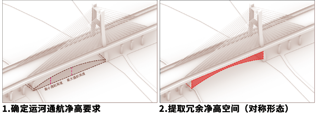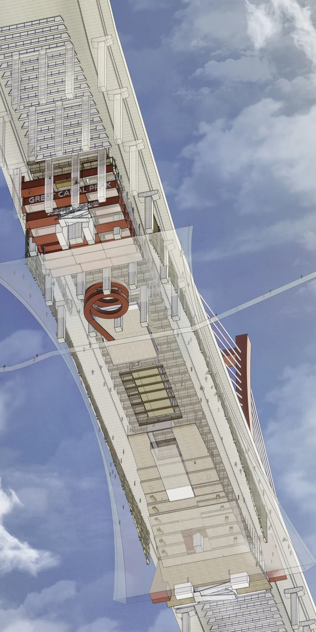 设计以保证运河通航高度为前提,经过航运数据分析后,合理选用桥下净高空间。同时,为呈现一个富有吸引力的空间形态,我们在结构设计上尝试了悬挑和悬吊并行的复合结构,确保建筑主体荷载不影响桥梁自身安全,并最大化演绎设计美学。