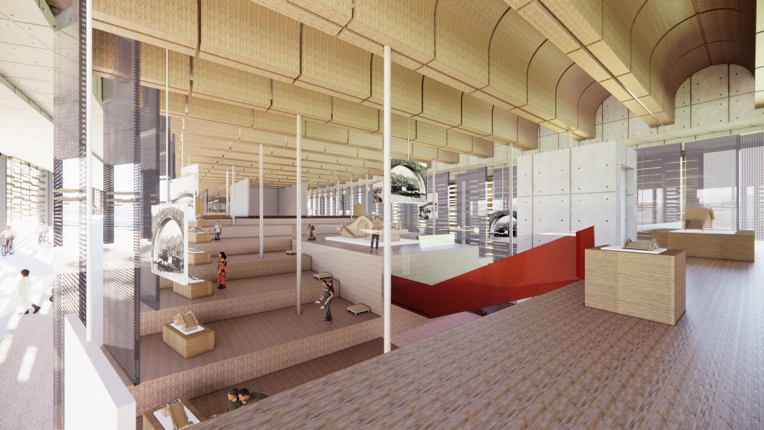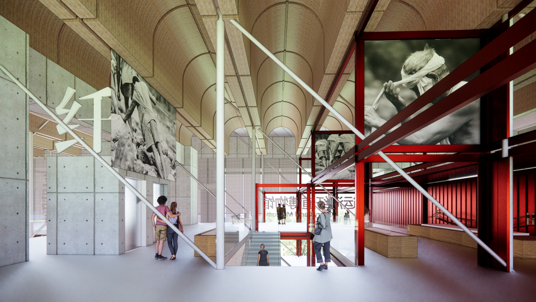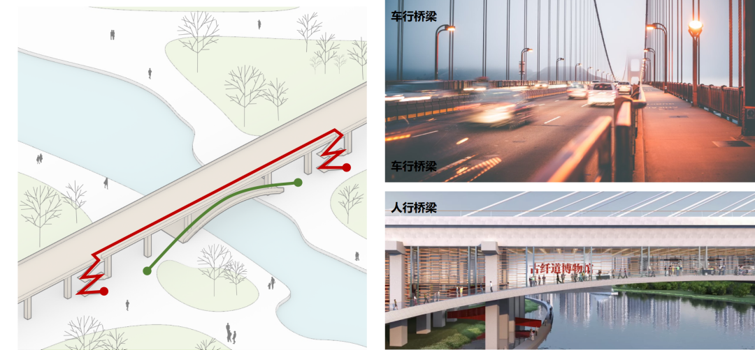 设计将运河文化、传统拱桥、本土传统建筑等意象在不同空间设计中进行了传承延续和融合呈现:纤道博物馆内的斜撑拉索设计,传递出纤夫拉船的澎湃动势;桥梁博物馆错落有致的游览路径和吊索设计,使游客亦如漫步古代拱桥之上;展厅选用的现代集装箱模块,呼应了绵延千年的漕运文化;建筑外立面悬吊的遮阳构件选用了本地竹材,借鉴了苏式花窗的光影韵律,打造出色彩丰富、轻松自由的空间氛围。