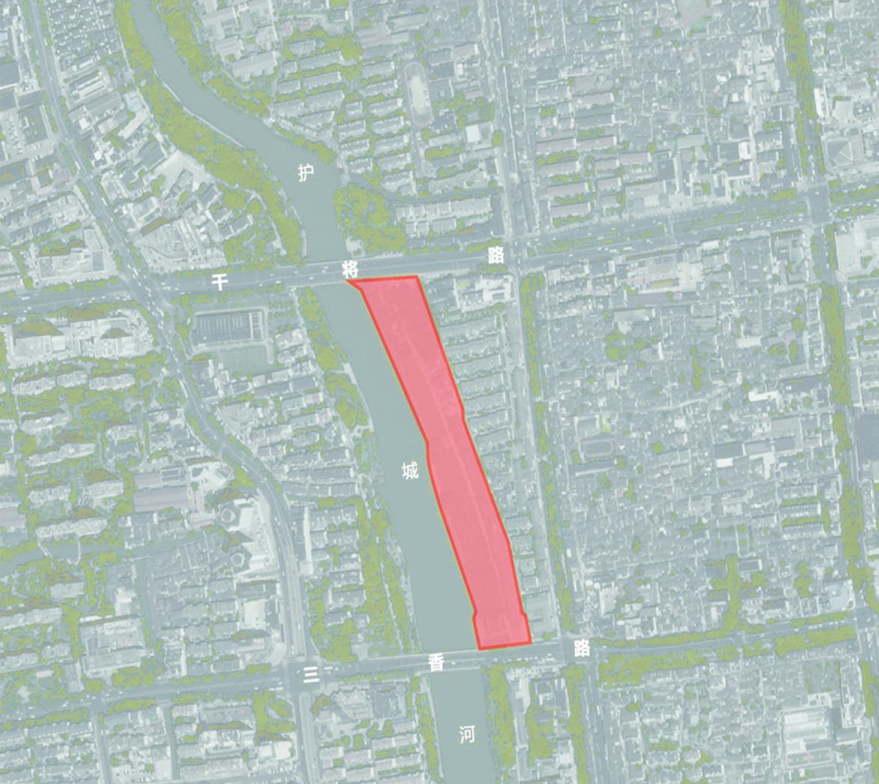 设计场地位于环护城河保护工程的西岸,东邻学士街,西接护城河水面,南望姑胥桥,北靠干将路。场地西侧的护城河始于春秋时期的吴国阖闾大城修建时期,距今已有两千多年的历史;姑胥桥边的古城墙遗址建于明代,距今也有五六百年的时间。