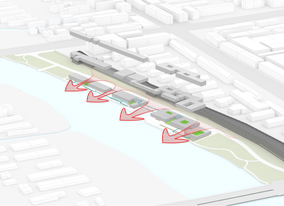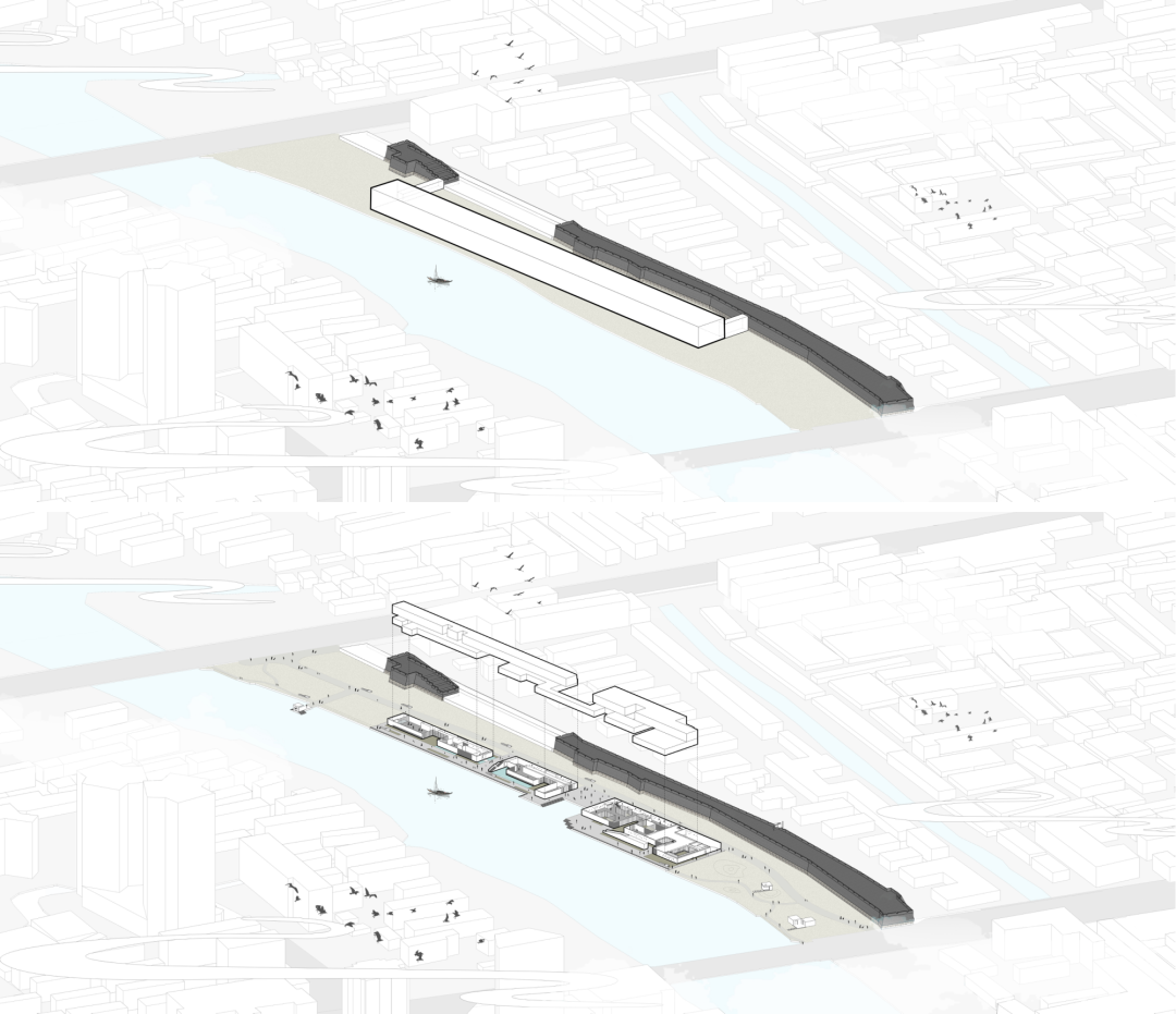 我们将建筑设置于城墙外侧,沿护城河展开,断裂的古城墙借助展馆在空间上得以延续。建筑底部设置了多处架空空间,重新塑造了城墙与护城河间的视觉通廊。