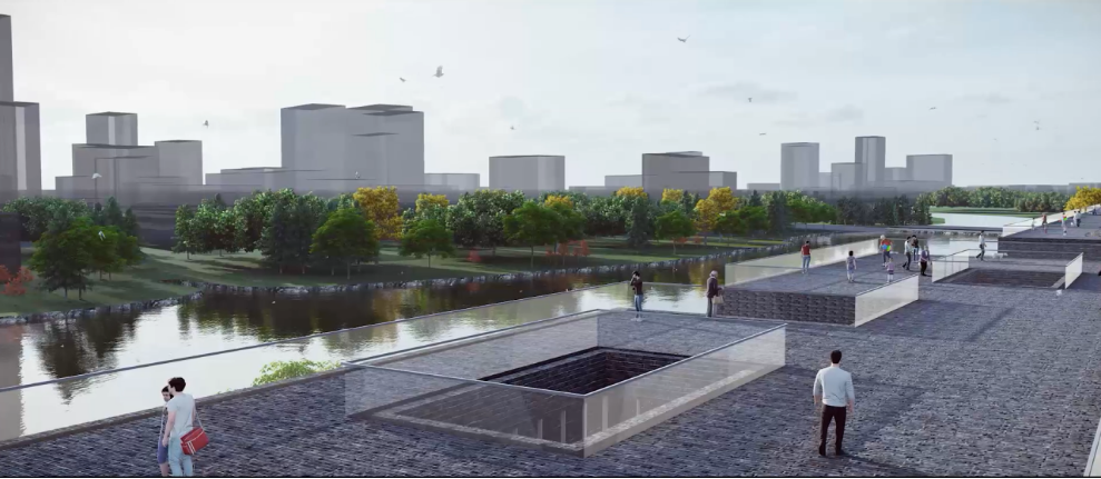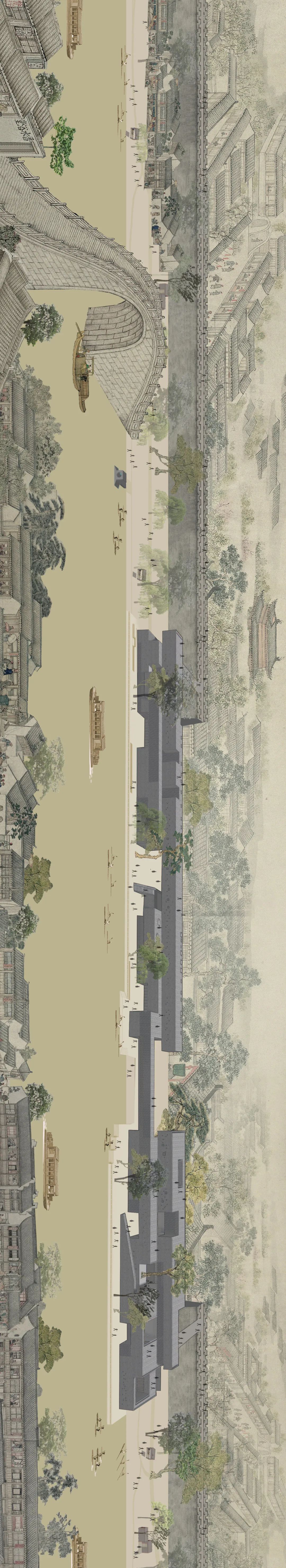 建筑体块的交叠创造了丰富的立体院落空间,底部建筑虚空间串联护城河,多元休闲配套设施置于其中,形成新的空间体验。在建筑内部,大小不同的“缝隙”空间好比园林“景窗”,将外部景观纳入眼帘;在顶部,护城河与城墙成为展品的一部分,泛舟护城河上可望城墙,漫步城墙上回望护城河,形成意境悠远的时光对景。