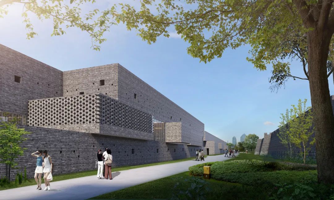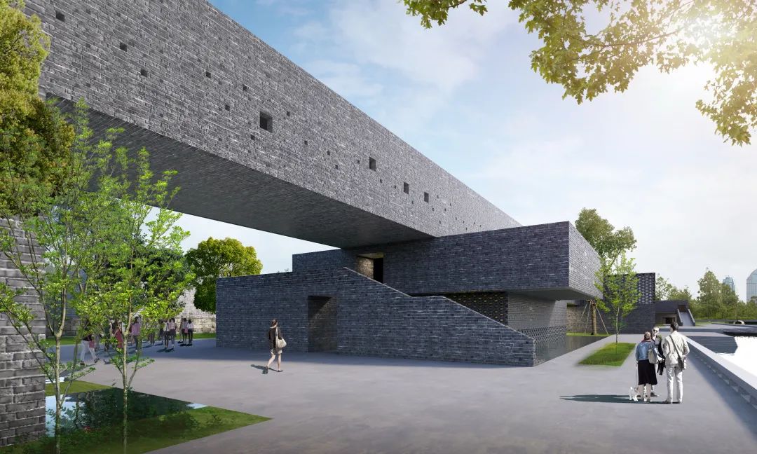 建筑设置于城墙遗址的断裂处,从城墙上自然延展出来,成为生长于城墙而又区别于城墙的全新组成部分。护城河水系通过建筑底部架空空间,延伸进入展馆内部,实现建筑与护城河的融合。城墙由曾经的围城成为新型展城,建筑在其中既是展陈空间,也是展品本身。
