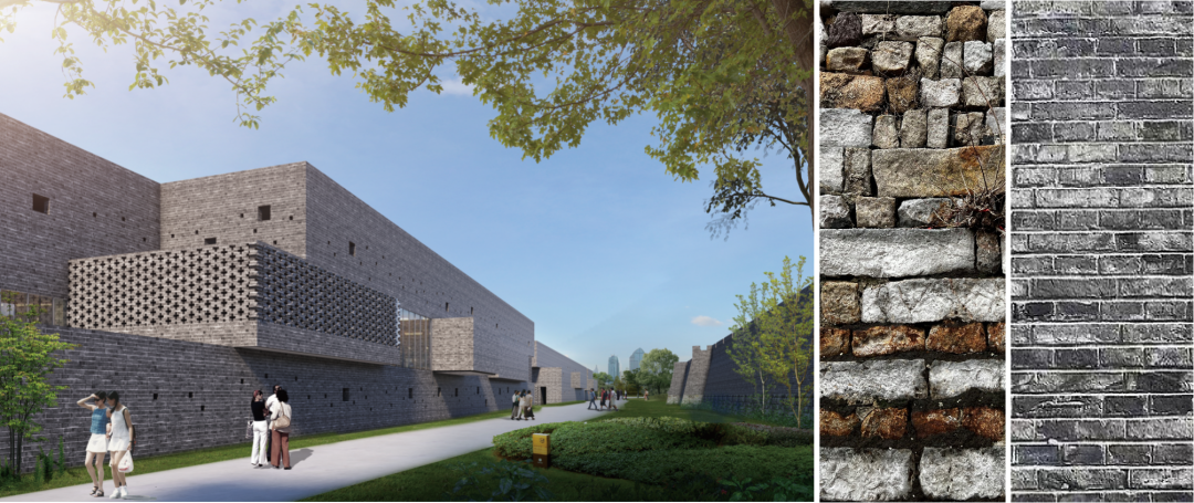 展示馆的建筑体块交叠错落,形成了不同尺度的庭院空间,无论是高处的屋顶平台还是低处的院落空间,都组合出了一个当代的立体姑苏园林,使展示馆和城墙之间形成了“看与被看”的趣味关系。在材料表达上,我们借助青砖这一极具江南特色的建筑材料,通过不同的砌筑方式呼应城墙机理,与城墙融合共生。