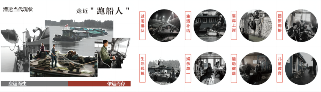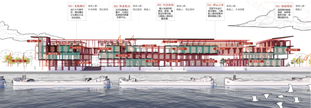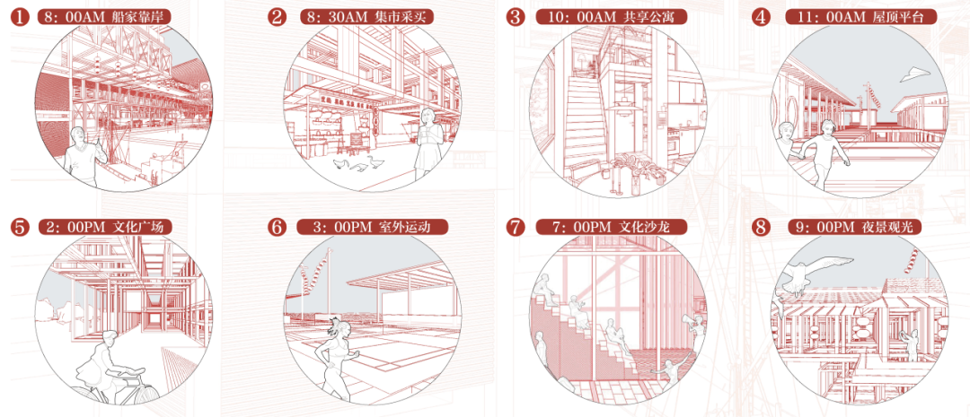 我们对跑船人的日常生活生产需求进行了调研,细致了解船员诉求和行为特点,并将上述分析融入到设计方案中,形成船家靠岸、集市采买、共享公寓、屋顶平台、文化广场、室外活动、文化沙龙、夜景观光八大场景。