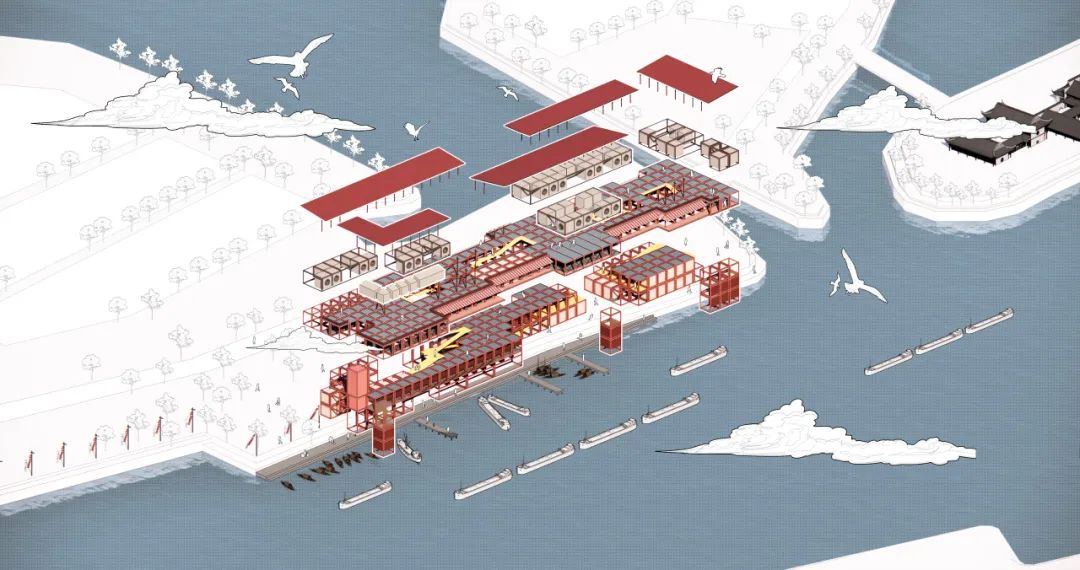 作品创意源于设计师对大运河文化的理解以及对跑船人生活的观察和思考。设计方案以改善运河跑船人的生活环境为切入点,提出了建设水上驿站的构想。驿站选址在运河岸边,临水而建。设计运用了装配式、模块化的建造方式,将漕运后勤、配套服务、文化交流等不同功能模块分置于不同平台之上,共同构成了新“漕运之家”。设计既体现了设计师对跑船人的人文关怀,又为周边居民与外来游客塑造了一个拥有运河文化特色的体验场所和富有活力的公共开放空间。作品契合竞赛主题,具有一定深度,成果表现较为精细生动。