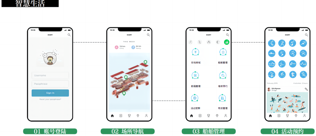 在前期调研中,我们了解到,因当前航运节奏较快、航程时间紧凑,跑船人往往没有充裕的时间上岸停留。因此,我们考虑了驳岸停留和低速穿行两种方式:跑船人可以选择泊船上岸采买或体验相应的服务;也可以选择通过手机上的“云驿站”提前预定生活补给包裹,在约定好的时间抵达驿站,当船只缓行时收取包裹,以节约航程时间。