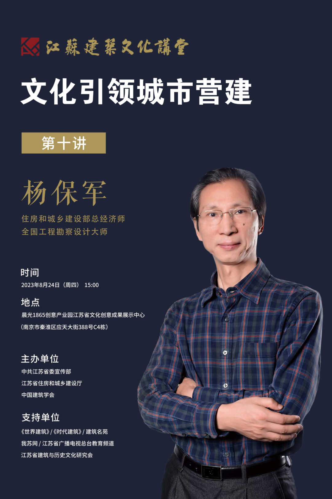 由中共江苏省委宣传部、江苏省住房和城乡建设厅、中国建筑学会联合主办的“江苏·建筑文化讲堂”第十讲将于8月24日在南京晨光1865创意产业园•江苏省文化创意成果展示中心举办。
