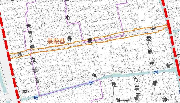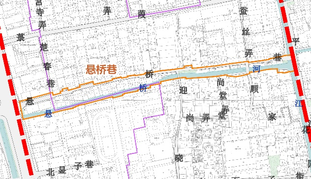 项目有9条东西向贯通性街巷,从南至北分别为:建新巷、钮家巷、肖家巷、大儒巷、南显子巷—南石子街、悬桥巷、菉葭巷、曹胡徐巷、东花桥巷。