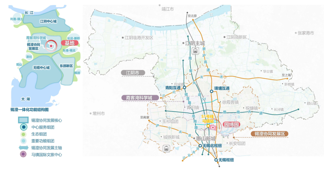 江苏省园艺博览会由省人民政府主办,设区市人民政府申办,自2000年以来已连续举办了十二届。第十三届江苏省园艺博览会由无锡市人民政府承办,选址于江阴市徐霞客镇马镇片区(原马镇镇区),是锡澄协同发展区的重要节点。竞赛用地包含园博会核心展示区(面积约229公顷)及原马镇镇区,总面积约597公顷。园博会核心展示区范围内有徐霞客故居、仰圣园(晴山堂石刻)、徐霞客博览园(博物馆)、滨水生态空间和闲置绿地等各类资源,原马镇镇区范围内有徐霞客公园、社区公共空间、街角巷弄等多类生活空间,文化底蕴深厚,生态环境良好,水网系统发达,存量建筑丰富。