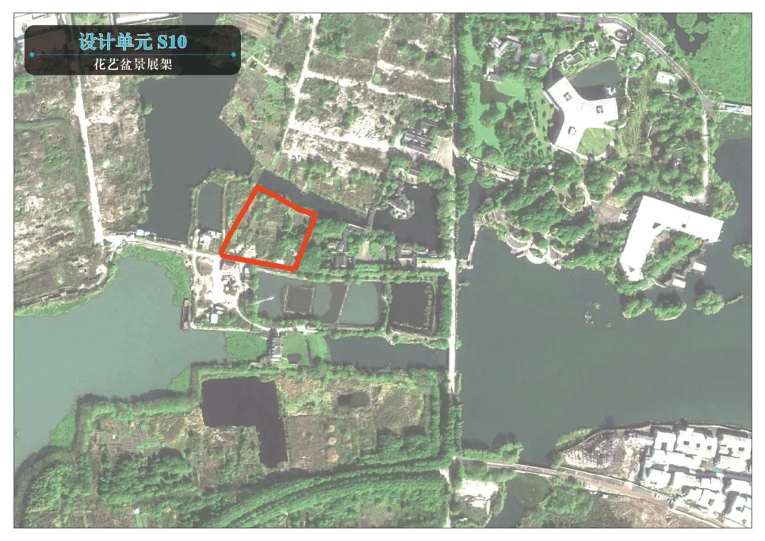 该单元位于园博会核心展示区中部的都市田园游赏区,西临白屈港,东侧临水,东西向和南北向主园路将该区域分为四个部分,由一条贯穿该区域的步行环路串联组织二十四个展位,各展位面积约50平方米。
