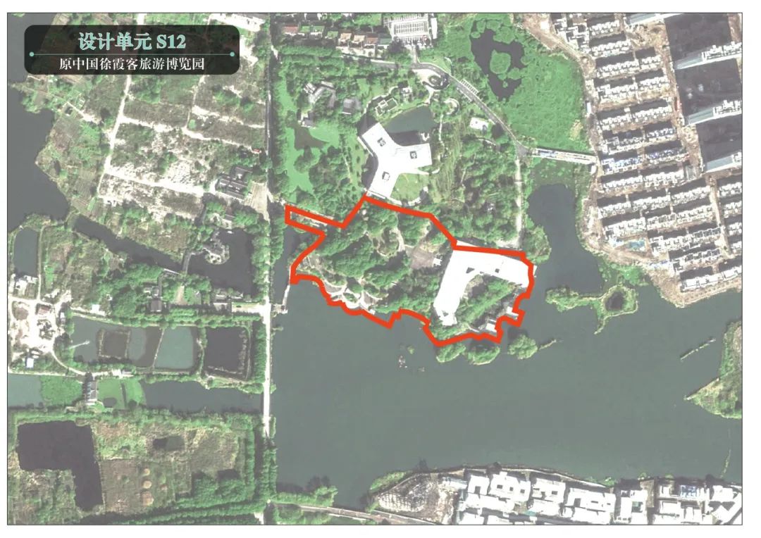 该单元现状为原中国徐霞客旅游博览园,面积约2.82公顷。现状植被较好,硬质景观存在老旧破损情况,西南角为保留的游圣码头,东部为存量建筑中国徐霞客旅游博物馆,建筑面积约5880平方米,建筑内部包含展陈、会议、办公等多种功能,拟改造作为园博会主展馆,会后转换为霞客文化科普教育基地。