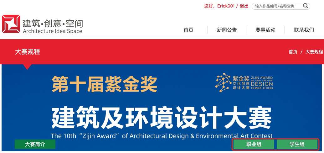 进入第十届“紫金奖•建筑及环境设计大赛”赛事页面,点击右上角“职业组/学生组”报名按钮,进入报名页面,按要求填写报名信息并提交审核。