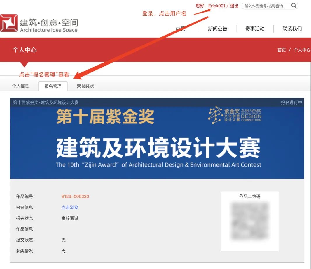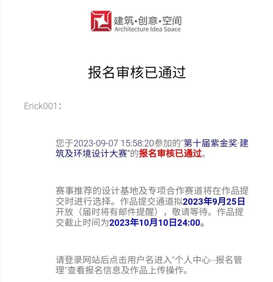 报名和作品提交的各流程节点均有邮件通知(注册时请务必完成邮箱验证),节点状态亦可在网站(点击“个人中心/用户名-报名管理”)查阅,如下图: