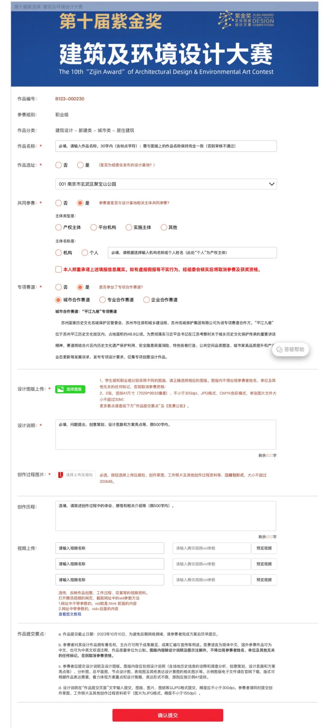 作品提交页面包括作品名称、作品选址、共同参赛、专项合作赛道、设计图版和设计说明等内容。