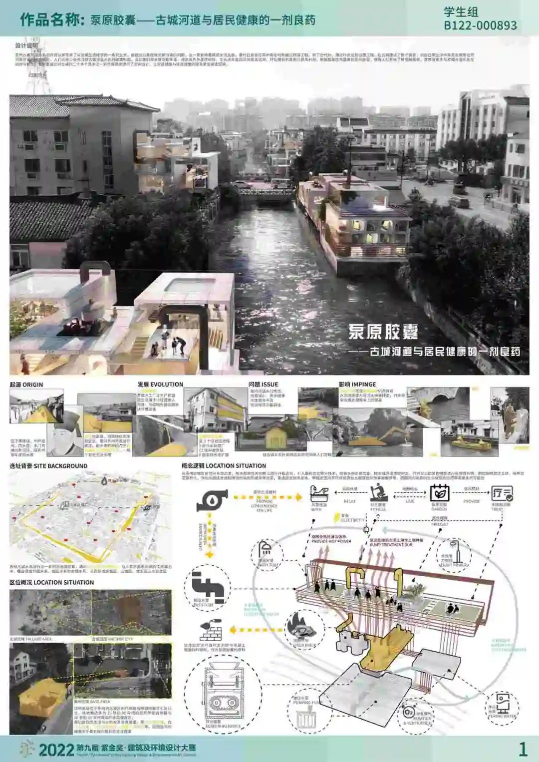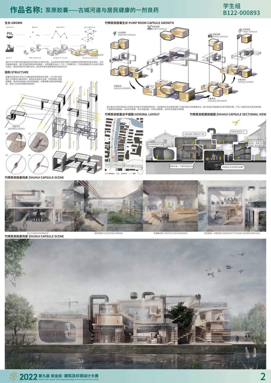 我对上届赛事印象比较深的学生组获奖作品是“泵原胶囊——古城河道与居民健康的一剂良药”。这个作品将目光投向容易被人们忽略的泵房空间,对古城河道泵站和周边邻近空间进行更新再利用,将场地的废弃物——淤泥土作为原材料,以“胶囊空间”为理念,组成了兼具儿童保育、洗浴运动、净水清淤等多功能的空间组合。这种思路总体是一种绿色思维,在场地、建筑、空间与内容方面也实现了闭环,具有一定的创新性、时代性和代表性。