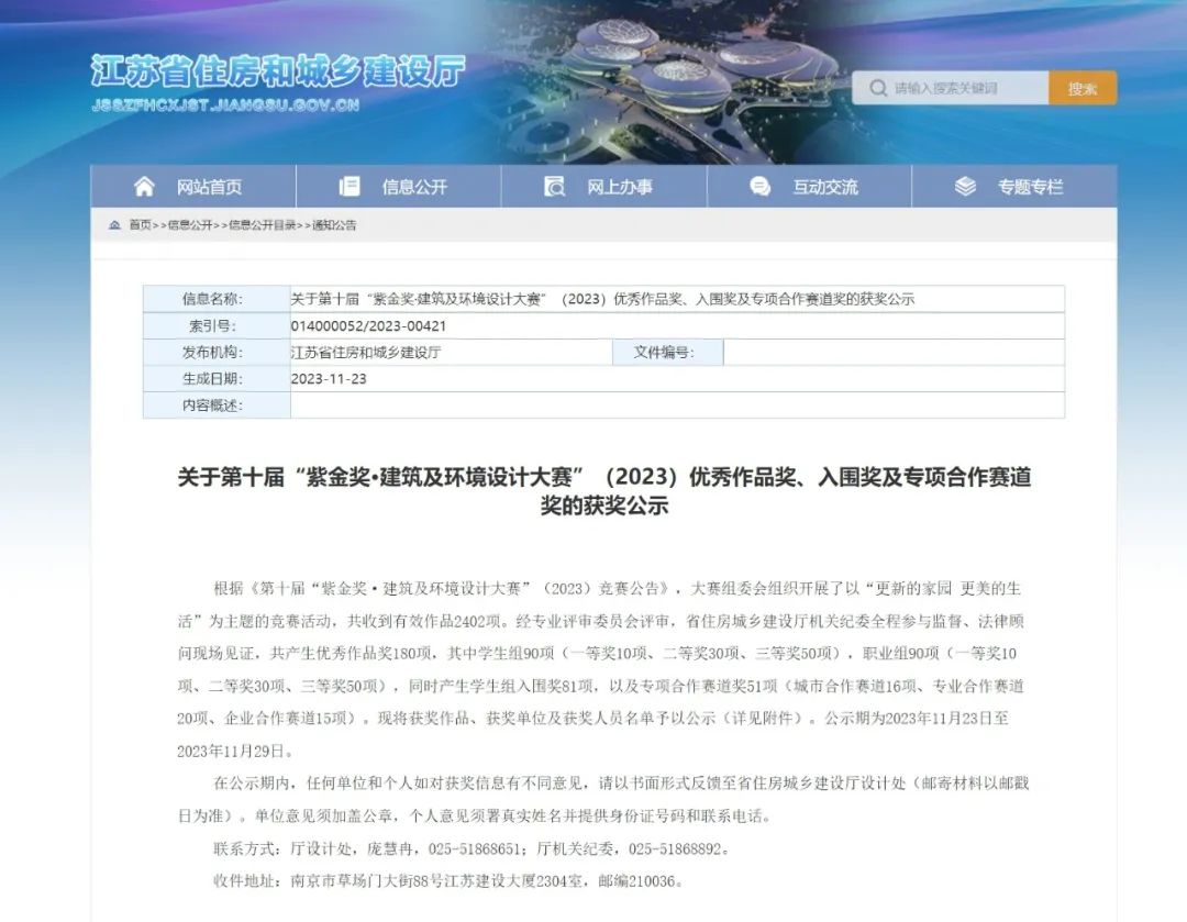 获奖公示 | 关于第十届“紫金奖·建筑及环境设计大赛”(2023)优秀作品奖、入围奖及专项合作赛道奖的获奖公示