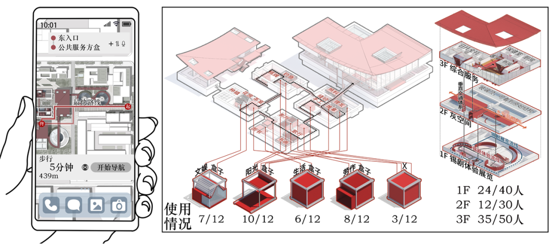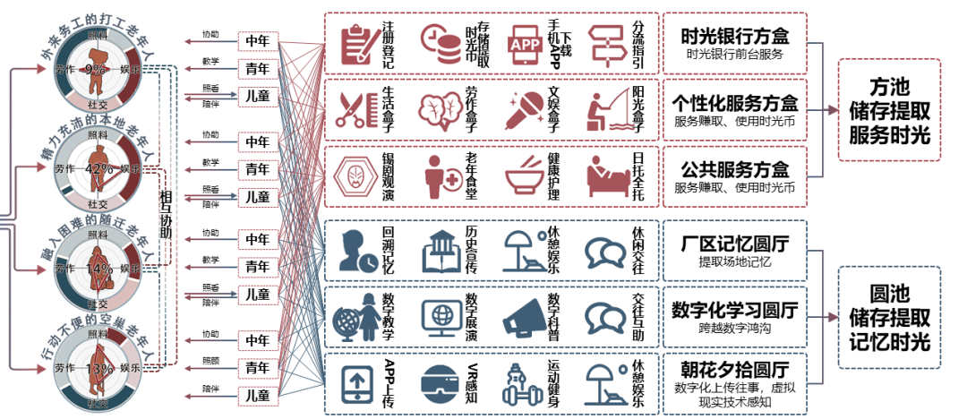 如在存储“服务时光”的方盒中,可在时光银行注册并下载APP,进入中庭的个性化服务方盒;老人可在这里链接当地社群,通过服务实现价值并赚取时光币;行动不便的老人可在公共服务方盒中享受日托和保健等服务。