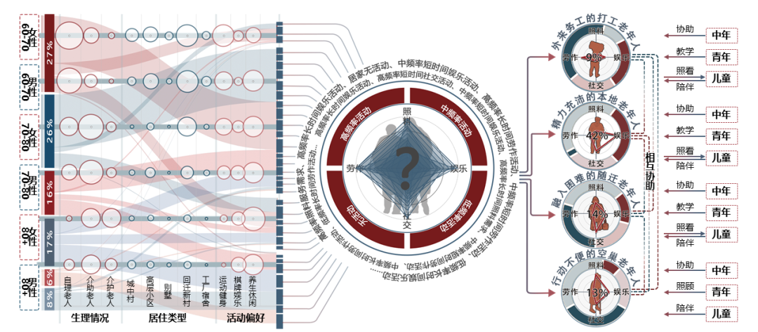 首先,我们利用WIFI探针和影像探头智能识别技术,结合多源大数据及调研访谈,对场地周边老年人群进行数字画像及聚类分析,识别出老年人群及相关年龄段人群的实际需求,以此为基础重组厂区功能。