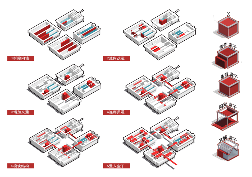对方池进行立体改建,通过拆解墙体与植入模块,将方池改造为“时光银行方盒、个性化服务方盒和公共服务方盒”三类功能盒子,方盒可根据当日平台计算需求,进行组装配置,也可通过个性化需求进行DIY设计。