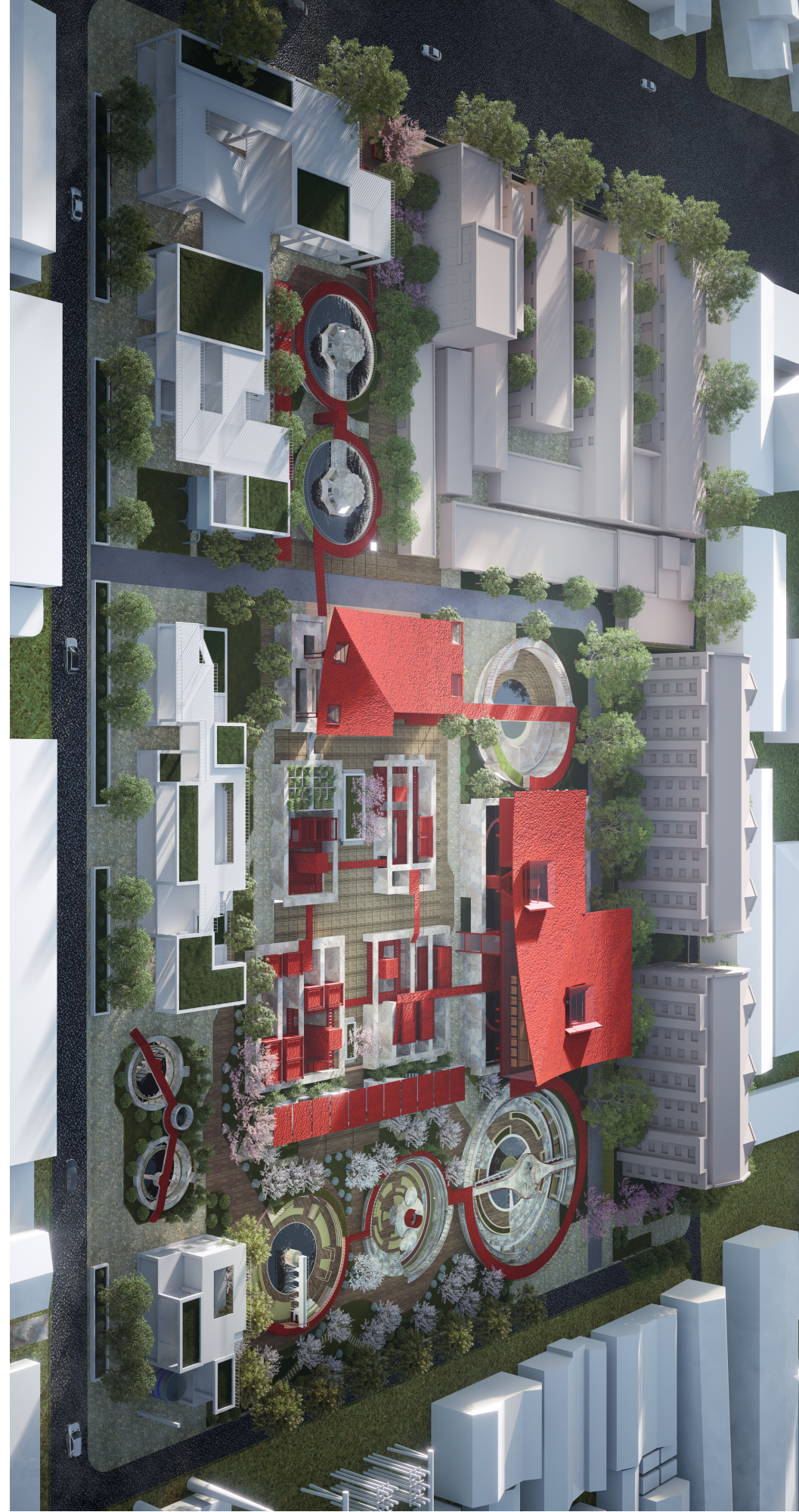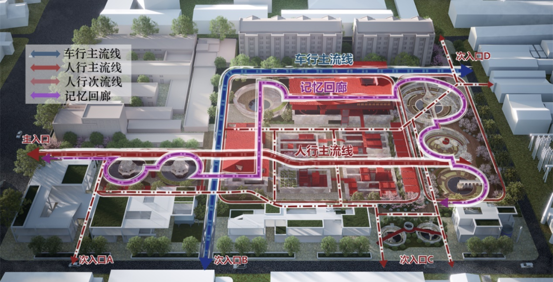 整体交通流线层面,我们设计了一条L型车行道实现人车分流,以一条东西向人行主轴和记忆回廊体验线路串联起各个方圆池,并设置4个次入口链接周边社区。