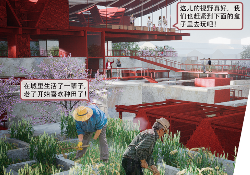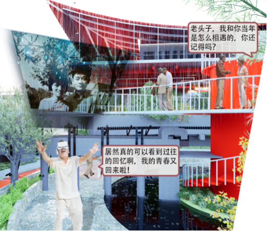 设计通过银发人群数字画像技术,研究周边老年人群及其关联人群的类型与需求,以“银发养老生活园”为设计概念,植入数字技术实现场地智能化改造,将污水处理厂更新为功能复合的新型适老化场所。