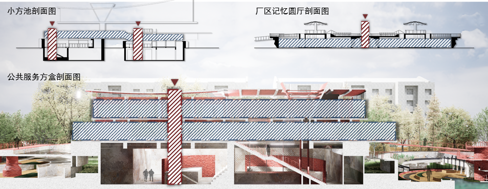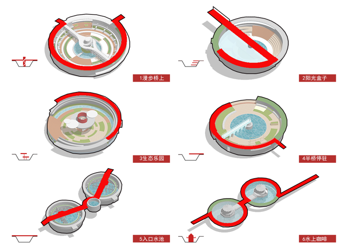 圆池改造为厂区记忆圆厅、数字化学习圆厅、朝花夕拾圆厅,各个圆池通过打开圆池弧墙形成连续开放空间,并通过无障碍记忆回廊进行串联,形成游览路线: