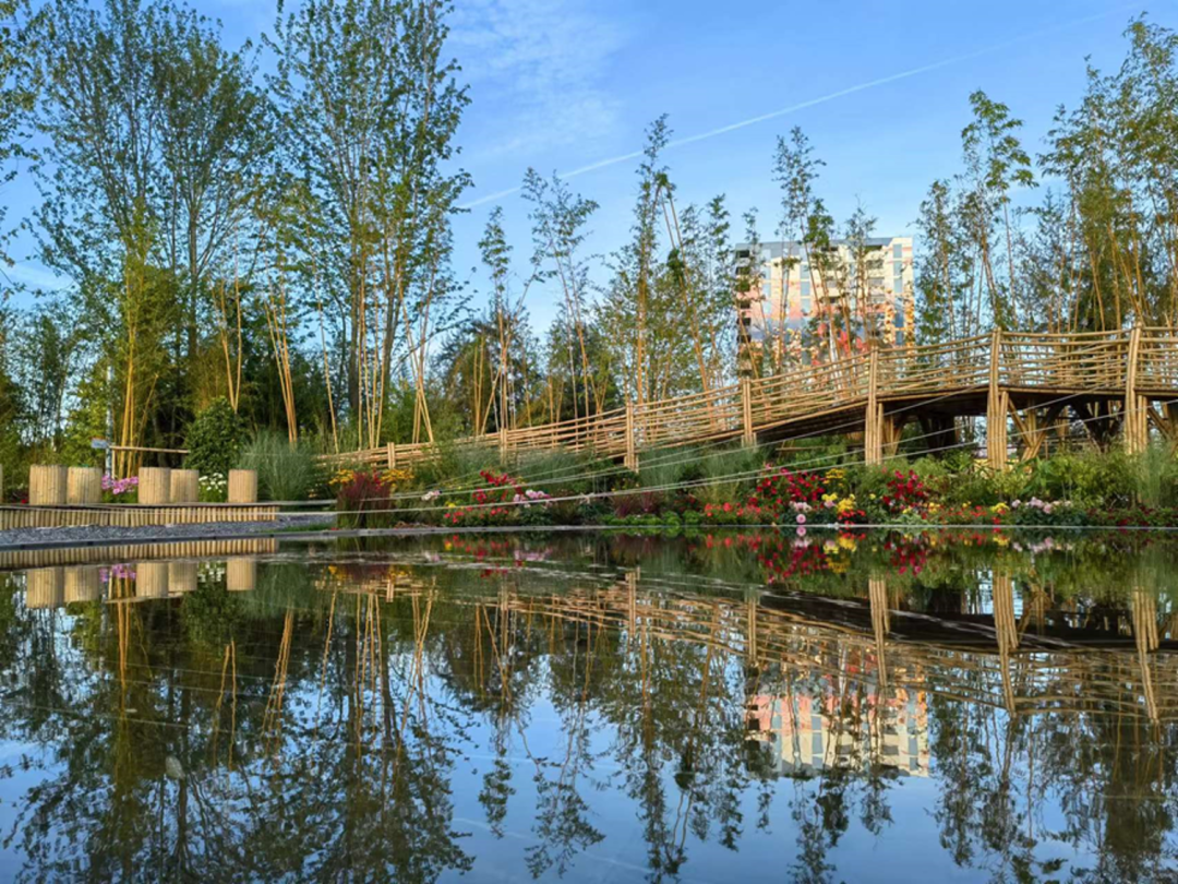 又如“中国竹园”作品,我们将源远流长的中国花文化和竹文化融进设计当中,采用233种中国本土花卉植物以展现四季不同的景观效果;设置象征“六弦琴”的亲子竹艺小品,增添游园趣味,既彰显绿色发展理念,又传承了中国传统园林的经典造园思想。