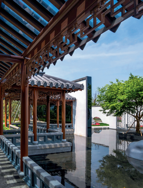 以第九届江苏省园艺博览会“小筑春深”作品为例,我们在“师法自然”“天人合一”的中国传统造园的思想基础上,综合运用创新的思维理念、技术手段和工艺材料,如主体建筑“沐春堂”运用了钢结构、玻璃、钢瓦等新兴材料展现传统建筑形态;假山水景将声控感应、雾森等技术结合,为游客提供更多游览互动体验;园林中的水环境则采用了“食藻虫引导水下生态修复”的综合技术,以净化水环境,综合展现苏州园林在当代建设中的传承与发展、探索与实践。