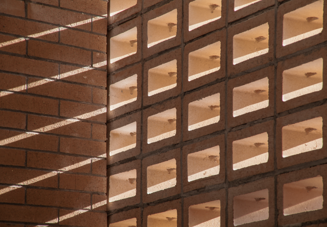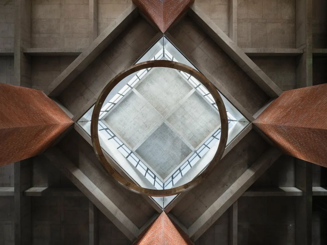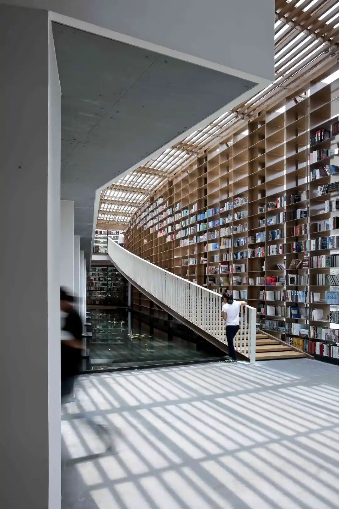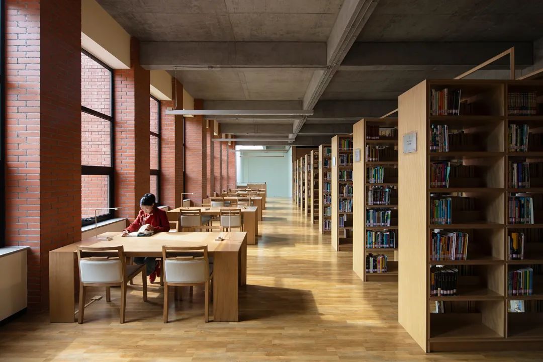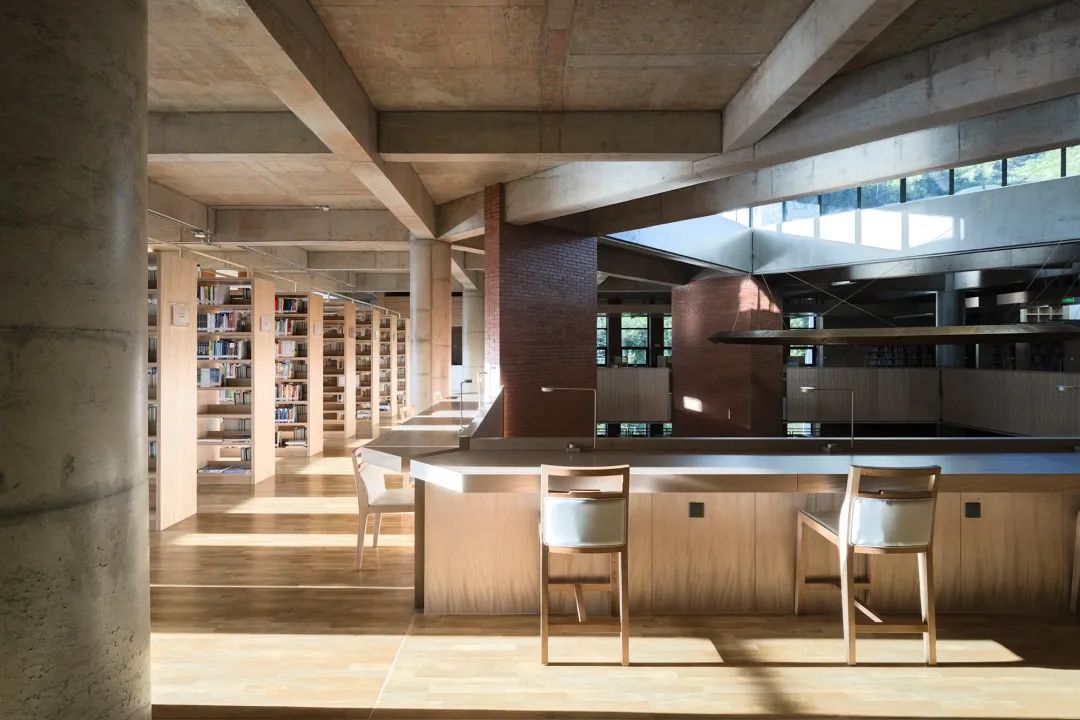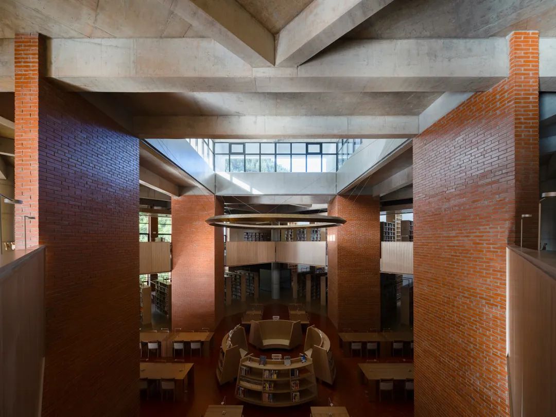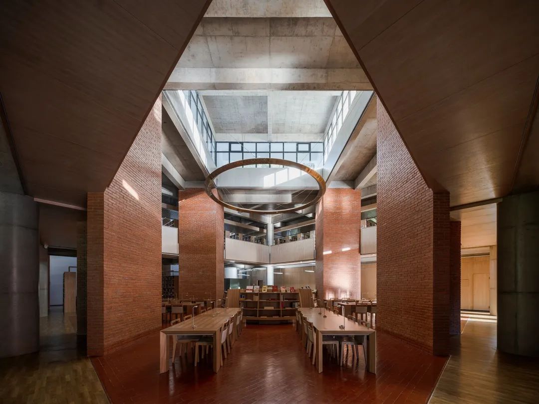图书馆空间采用了围绕两层中庭的角对称设计,一套扭转45度的砖柱系统让中庭体现出了更大尺度并且强化了空间的中心感。