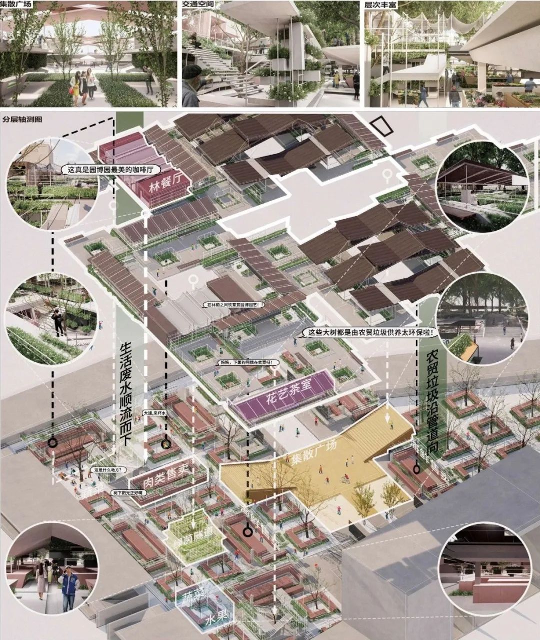 作品通过对现有农贸市场的大胆改造更新,将农贸市场的市井生活与园艺展览功能巧妙结合,采用分层分片组合式的设计方式,运用立体绿化、太阳能、垃圾收集自循环系统等绿色生态方法,展现了旧城镇改造更新过程中“脏乱差”的旧农贸市场向“洁净美”的邻里中心的华丽转型,较为全面地展示了生活与园艺,让“邻里”的烟火气与“林里”的园艺美在这个立体的“花镜城市公园”里得到完美统一。