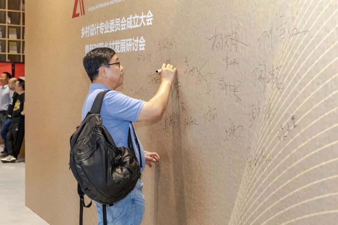乡村设计专业委员会成立大会由江苏省建筑与历史文化研究会常务副会长章小刚主持。专委会牵头筹建人、江苏省建筑设计研究院股份有限公司执行总建筑师刘志军先生作专委会筹建情况报告。刘大威会长和卢中强董事长共同为乡村设计专业委员会揭牌。省乡村规划建设研究会常务副会长杨洪海为南京市的赵坝村和桦墅村、扬州市沿湖村、仪征市庙山村颁发了实践基地铜牌。